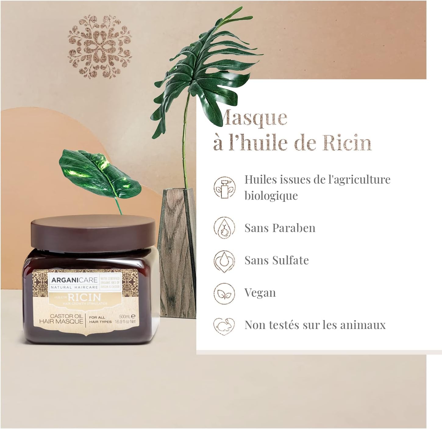 Arganicare offers a wide range of hair care and skin care, most of which are developed around a flagship natural active ingredient: argan oil. Used for centuries, this vegetable oil nicknamed “liquid gold” is a true beauty secret in Morocco. Made from the fruits of argan tree, it is rich in fatty acids such as omega 3, 5, 7 and 9 as well as vitamin E (tocopherol) and antioxidants, as good for caring for your hair as your epidermis. Combining centuries-old tradition and advanced technology, the company has developed different formulas in which argan is combined with proven active ingredients: castor oil, coconut oil, macadamia oil, shea butter, collagen, aloe vera, keratin and many more. Some of these assets are also at the centre of their own product lines with targeted effects. Entirely dedicated to beauty treatments, the Arganicare brand develops different products: shampoo, conditioner, hair or skin mask, hair serum, detangling spray, day or night cream, scrub, face cleanser, among others. High-quality Arganicare compositions are made from oils derived from organic farming, paraben-free and sulphate-free. Vegan and perfectly ethical, brand formulas are not tested on animals. The Arganicare castor mask is specifically designed to bring maximum benefits to dry, damaged or weakened hair that is sensitive to everyday aggressions. This hair care with protective, nutritious and strengthening effects helps nourish the hair fiber, make it more resistant and stimulate growth. It is used after shampooing, once or several times a week. After application, your hair is shiny, soft and full of life. This product has been awarded at the Victoires de la Beauté 2018/2019.