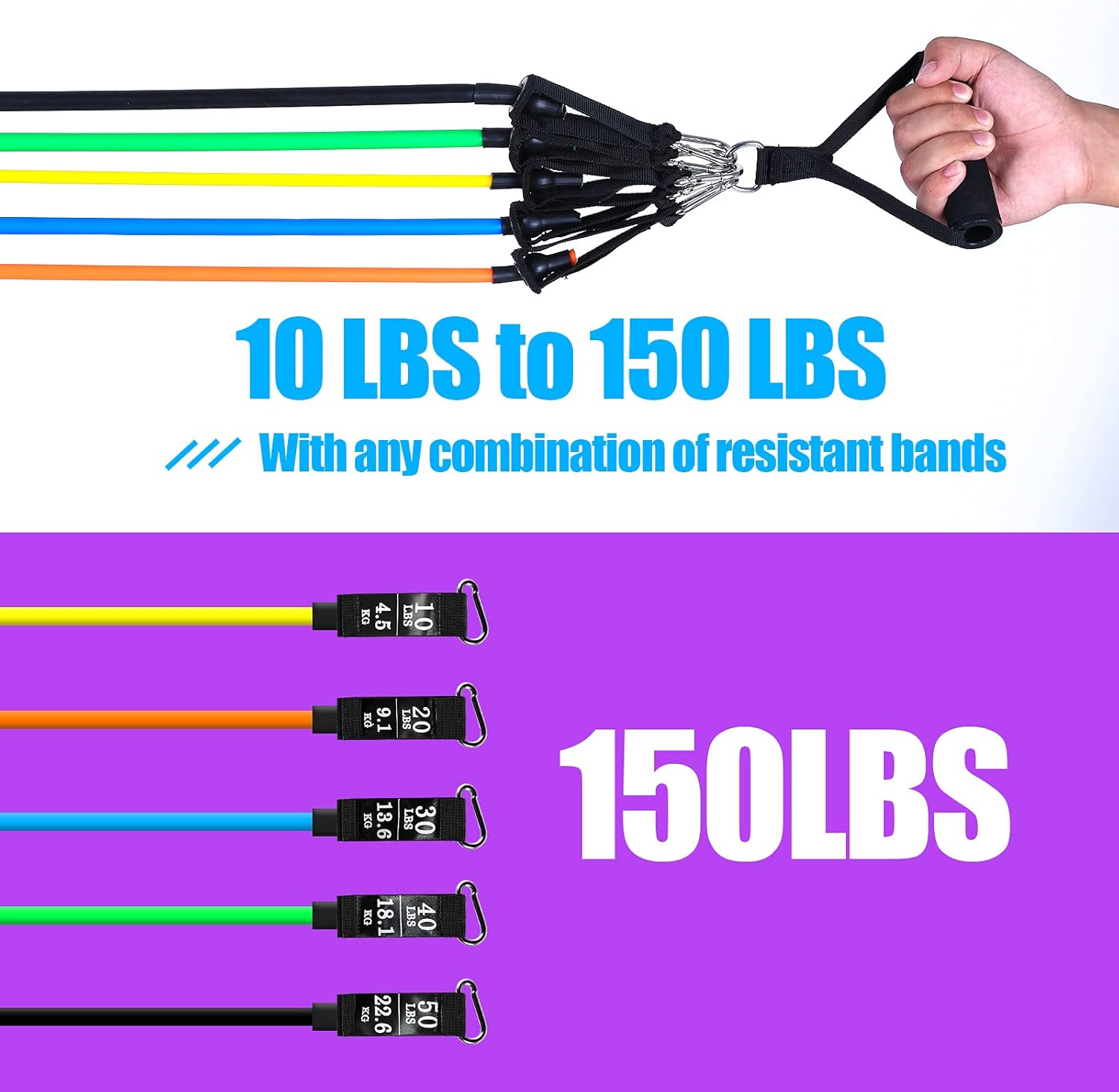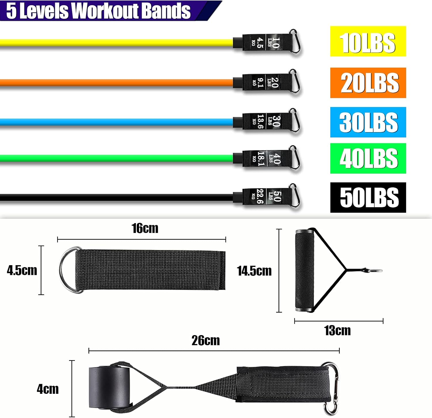 💪【5 Different Levels】💪 The resistance bands come with 5 different resistance level 10lbs, 20lbs, 30lbs, 40lbs and 50lbs in 5 different colors. You can use the bands independently or in any combination with a maximum resistance level of 150lbs.This set meets your exercise needs whether you’re a fitness enthusiast or a beginner.It comes with 5 latex resistance bands, 2 hand grips, 2 ankle straps, 1 door anchor, a carry bag.