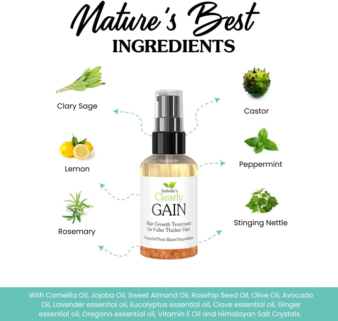 Transform your hair with Isabella’s Clearly GAIN, a natural and effective hair growth product that promotes healthy hair and scalp. Whether you’re struggling with hair loss, thinning hair, hair fall, or just naturally thin hair, GAIN is formulated with plant-based ingredients, essential oils, and herbal extracts to revitalize hair follicles, stop hair loss, and stimulate new hair growth.