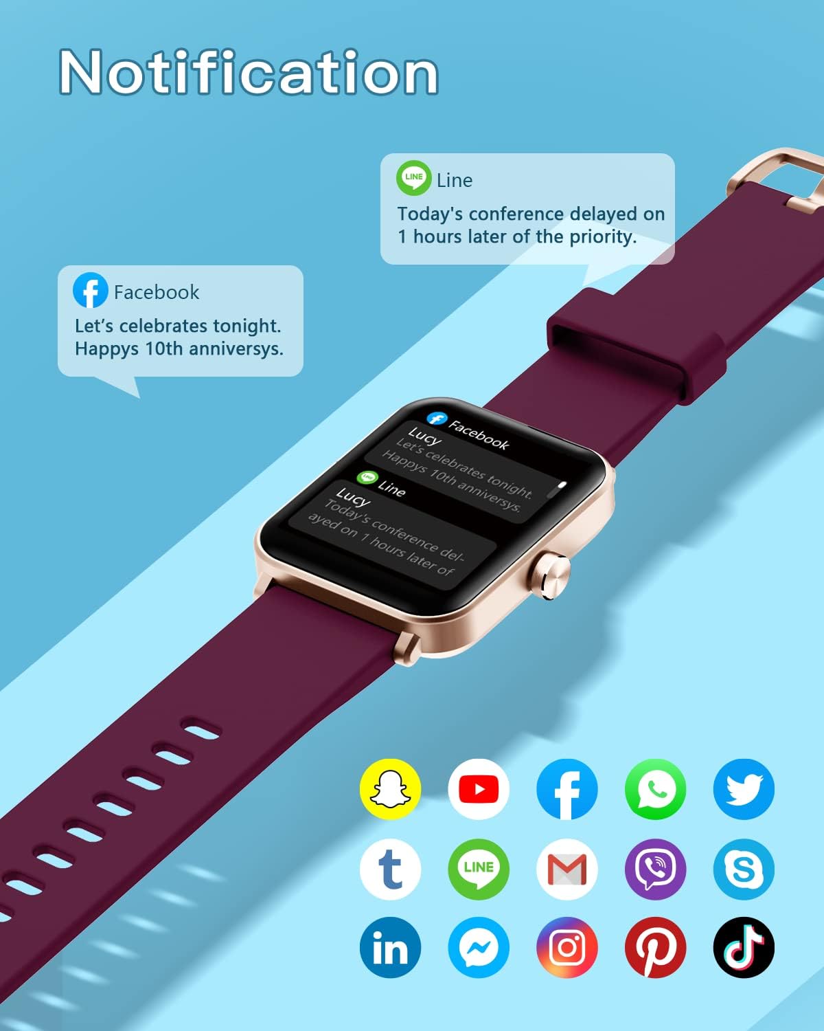 【Smart Notification & More Practical Tools】The smart watch will vibrate and remind you messages from Twitter, Whatsapp, Facebook, Instagram, and more to help you keep in touch on-the-go. It has rich practical tools including camera/music control, timer, alarm clock, sedentary reminder, weather, breath exercise, brightness adjustment etc, meet all your daily needs.