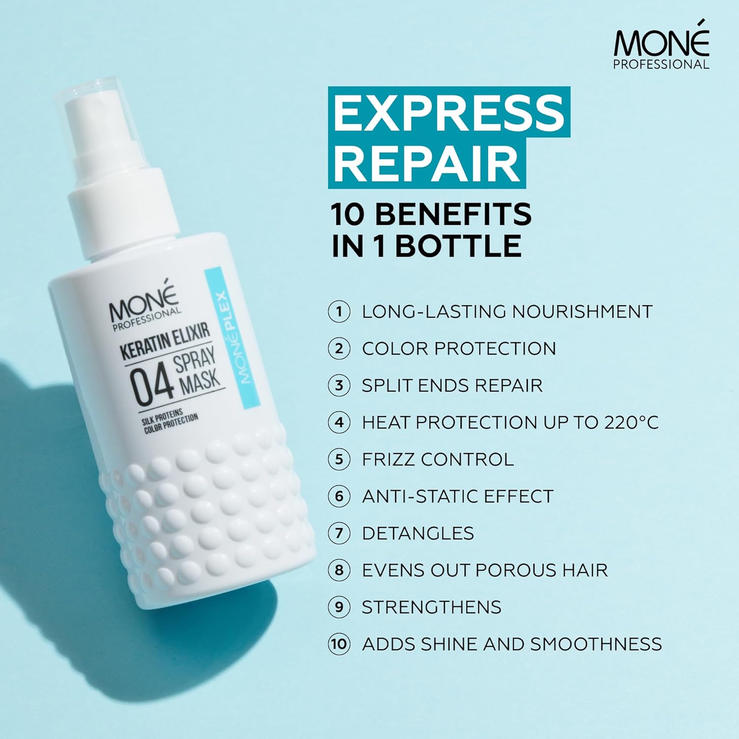 MONEPLEX 04 – Professional Keratin based spray with multiple benefits that will let you highly satisfied. To be used daily as a detangler or thermoprotective spray. Repairs, Protects, and Cares deeply.