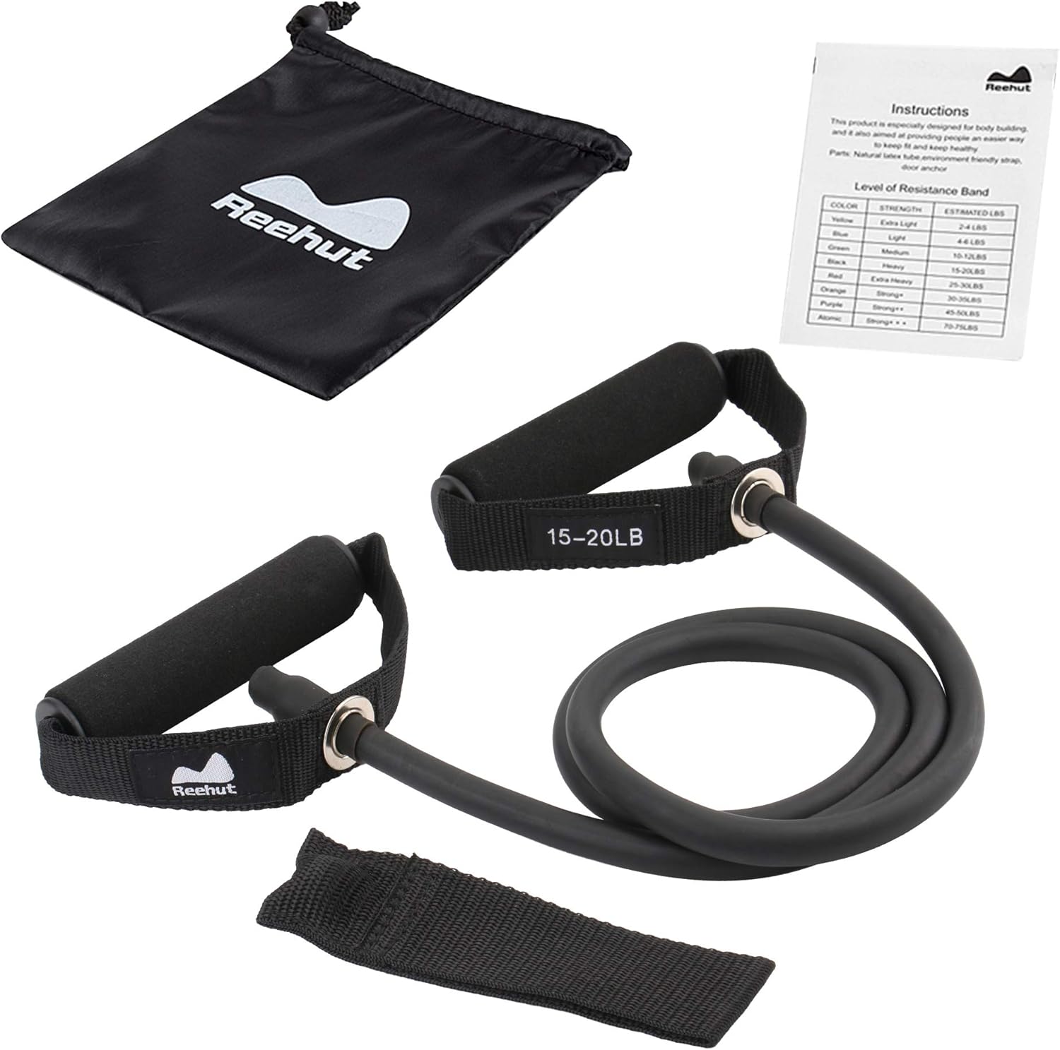 Single Resistance Band:Reehut resistance bands have seven colors with seven different resistance levels.Length of 3.6ft, Yellow (2-4 lbs.), Blue (4-6 lbs.), Green (10-12 lbs.), Black (15-20 lbs.), Red (25-30 lbs.), Orange (30-35 lbs.), Purple (45-50 lbs.) and Atomic (70-75 lbs.).