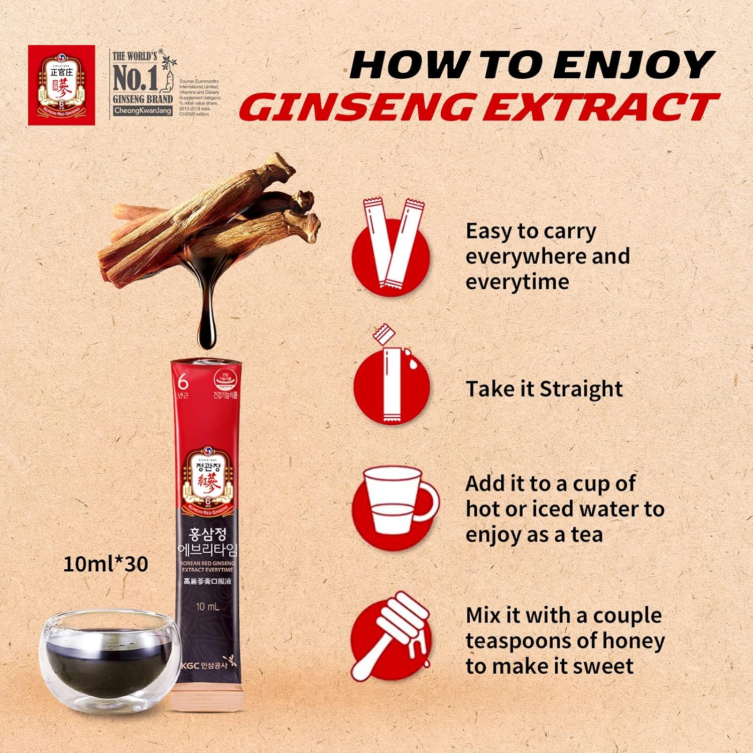 CheongKwanJang Korean Red Ginseng Everytime, Natural Energy Supplements for Men&Women, Enhance Immunity, Alleviate Fatigue, Blood Circulation, 6-Year Korean Ginseng,10mlx30ea