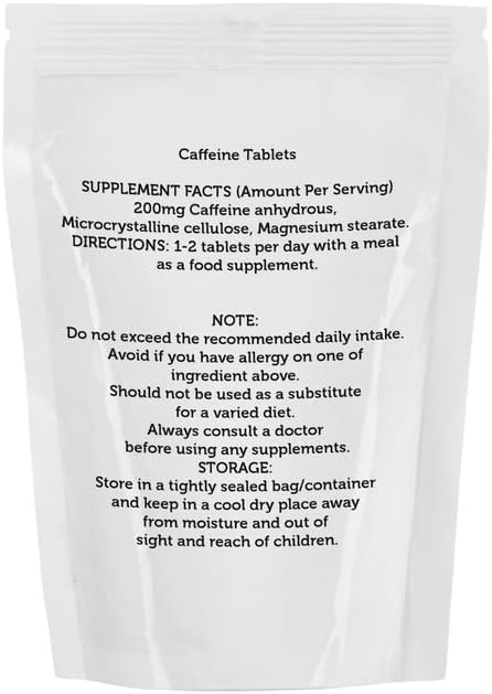 Caffeine Tablets SUPPLEMENT FACTS (Amount Per Serving) Caffeine 200mg. OTHER INGREDIENTS: Microcrystalline Cellulose, Dicalcium Phosphate, Magnesium Stearate, Silica. DIRECTIONS: 1-2 tablets per day with a meal as a food supplement. (V) Suitable for Vegans and Vegetarians. Allergens Free. NOTE: Do not exceed the recommended daily intake. Avoid if you have allergy on one of ingredient in bold above. Should not be used as a substitute for a varied diet. Always consult a doctor before using any supplements. STORAGE: Store in a tightly sealed bag/container and keep in a cool dry place away from moisture and out of sight and reach of children.