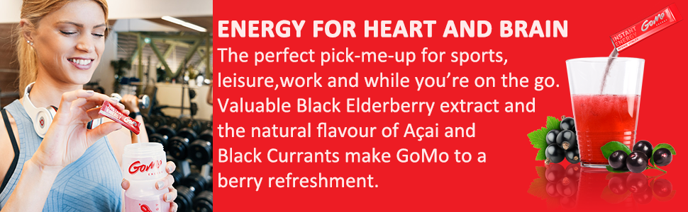 LOW CALORIE – HIGH VITALITY, with less than 20 kcal per portion GoMo keeps fatigue at bay, and delivers extra brain and body power. Energy drink for sports, work, and on the go with unique flavour combination of Acai and Blackcurrant.
