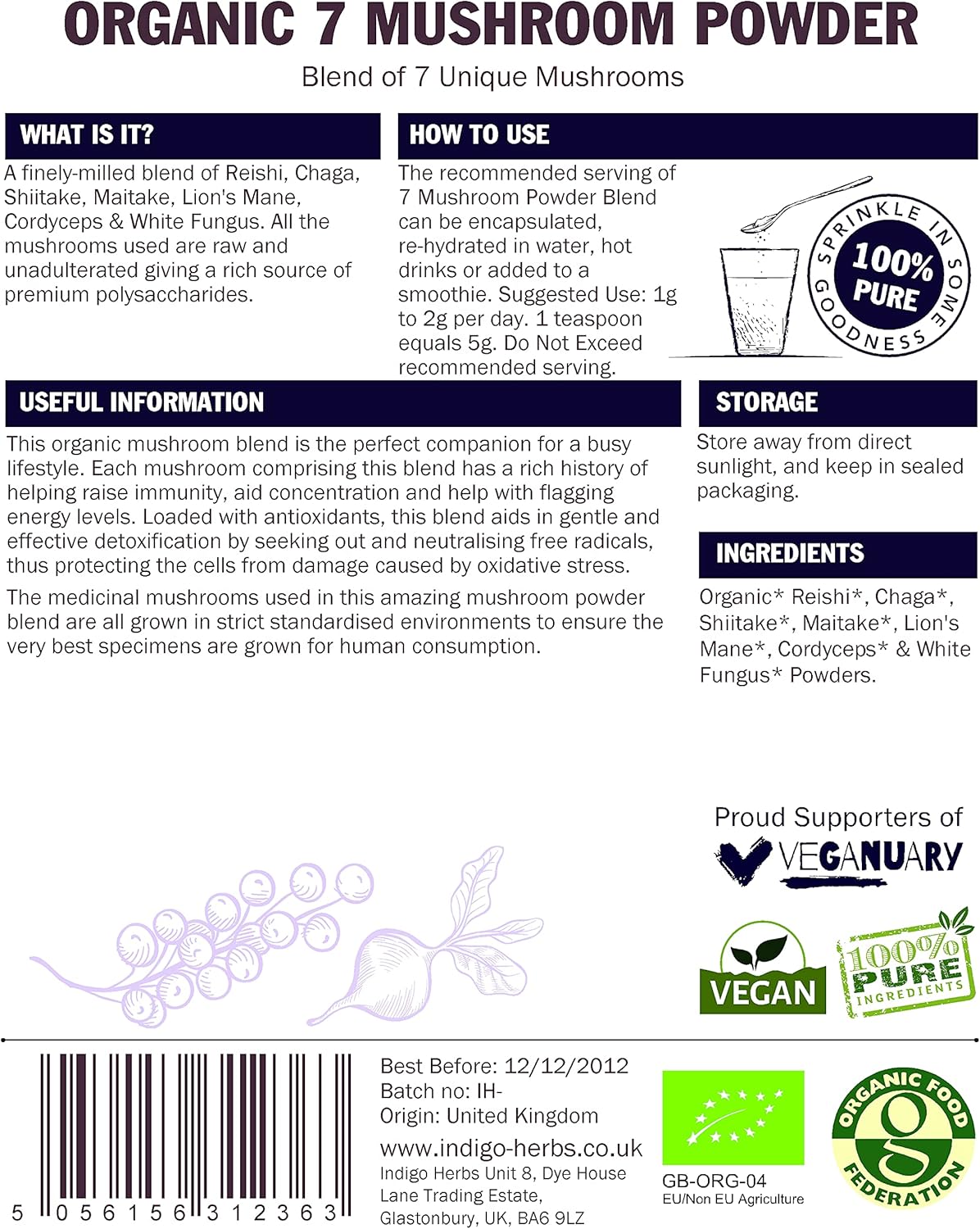 Indigo Herbs Organic 7 Mushroom Powder Blend 100g | Blend of 7 Adaptogenic Mushrooms| Vegan | No Additives & GMO Free| Lion’s Mane, Reishi, Cordyceps, Maitake, Chaga, Shiitake, White Fungus
