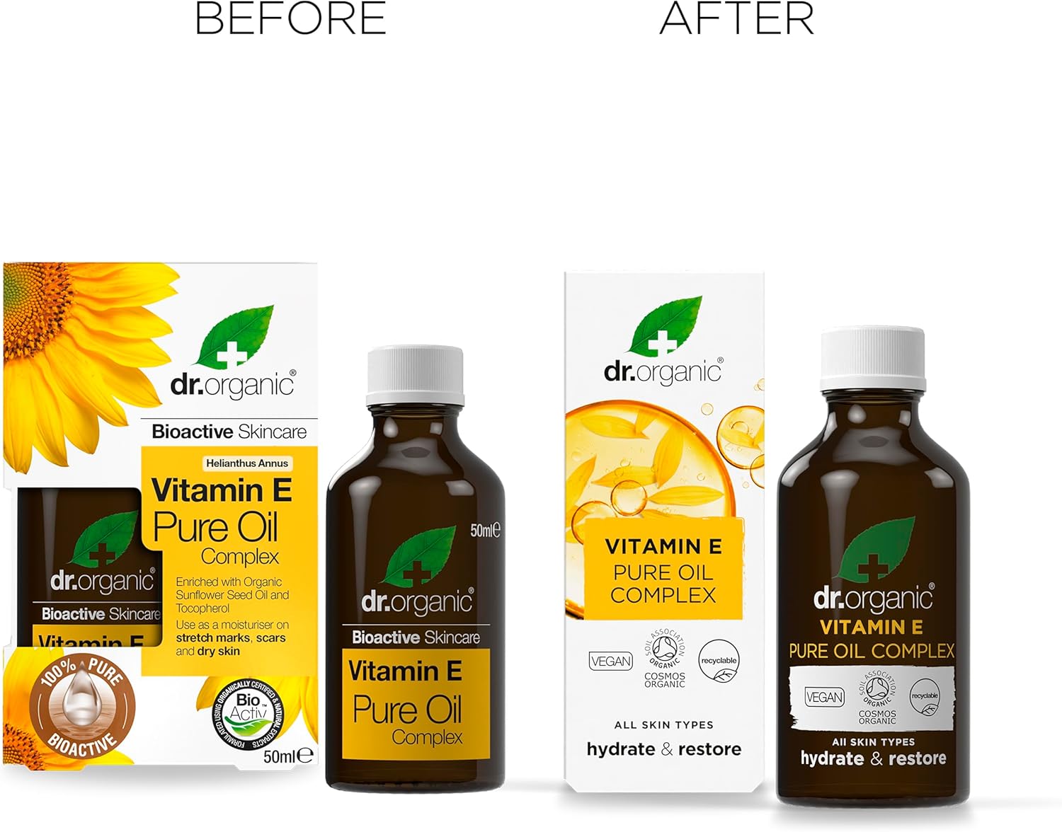 Dr Organic Vitamin E Pure Oil, Hydrating, Essential Oil, All Skin Types, Natural, Vegan, Cruelty-Free, Paraben & SLS-Free, Certified Organic, 50ml, Packaging may vary