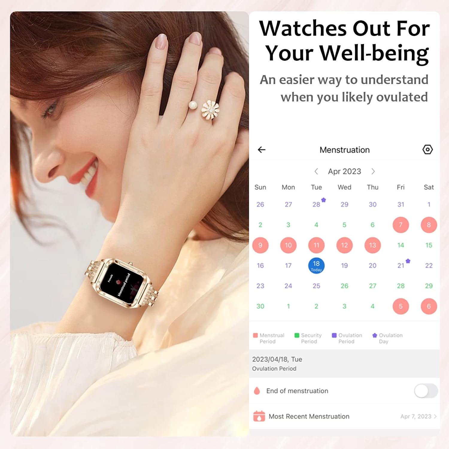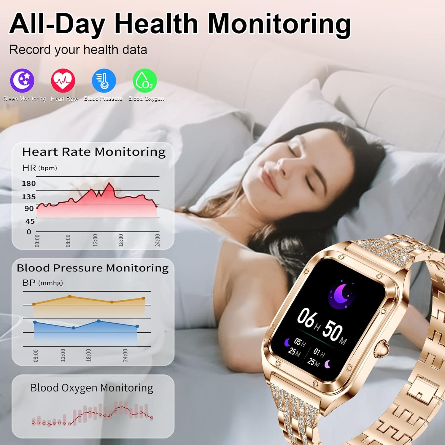 💖 【Blood Oxygen & Heart Rate & Sleep Monitoring】The smart watch for women uses an advanced sensor chip and a photoelectric sensor for accurate monitoring. It provides 24-hour continuous measurement of your health indicators (SpO2, heart rate, and stress), as well as women’s menstrual cycle reminders. In addition, smart watch women automatically monitors your sleep status (deep sleep, light sleep, waking up) and provides a comprehensive sleep quality analysis, so better sleep starts now.