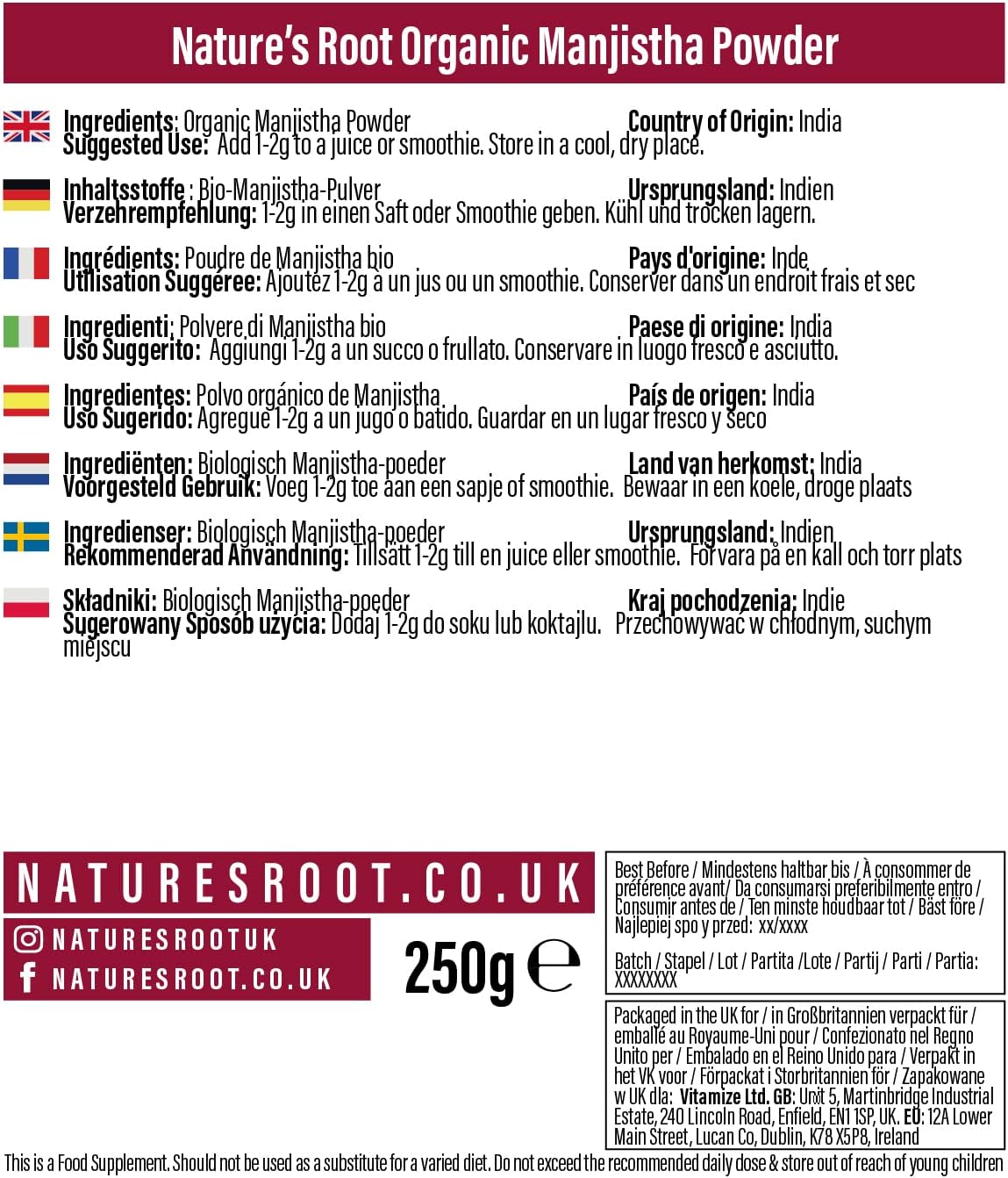Natures Root Organic Manjistha Powder 250g – Organic Rubia Cordifolia – Promotes Healthy and Clear Skin – Ayurvedic Herbal Blood Purifier
