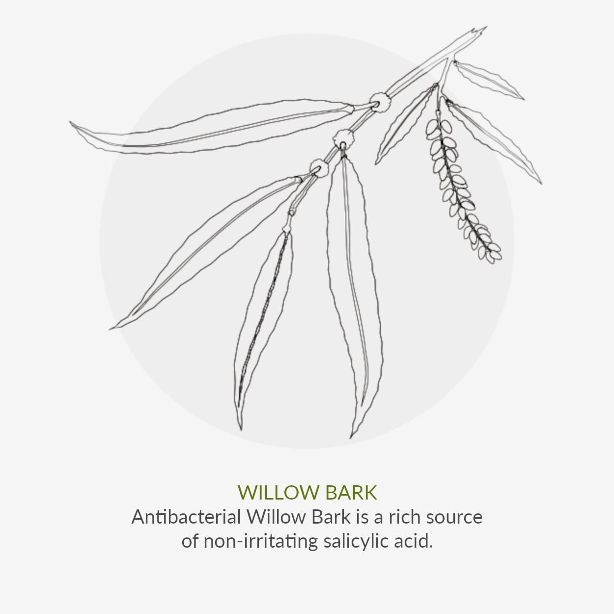 TEA TREE, WILLOW BARK & WITCH HAZEL are our key anti-blemish actives. Tea Tree has strong anti-inflammatory properties, whilst Willow Bark is a rich source of non-irritating salicylic acid and astringent Witch Hazel combats oiliness.