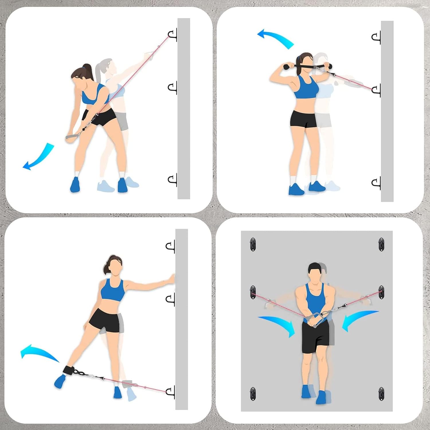 Different numbers of hook anchors allow you to target the chest, abdomen, arms, legs, back and shoulders with different workout movements.