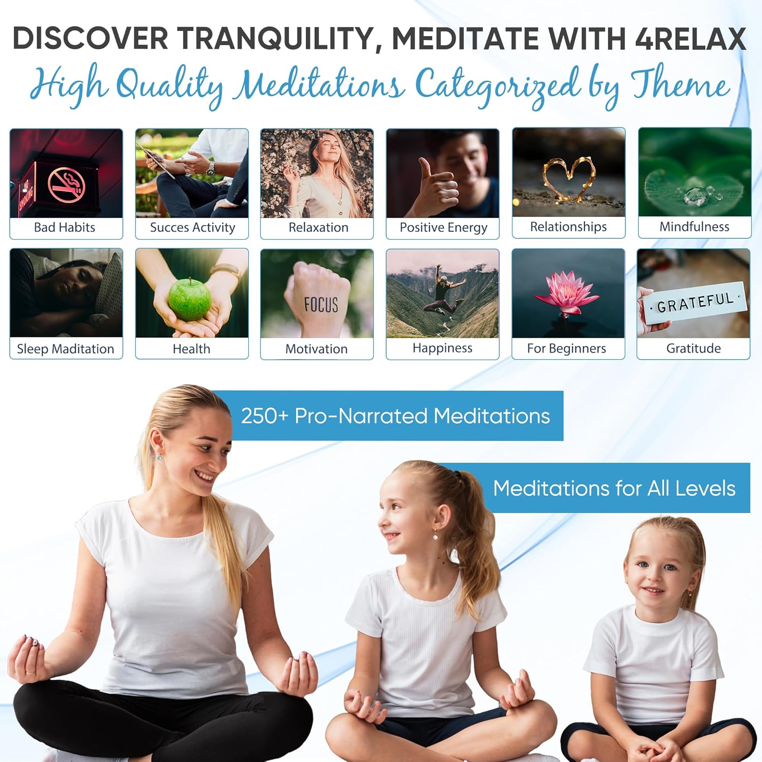 MEDITATION DEVICE – 250 guided meditations to relieve stress & anxiety. High quality meditations categorized by theme and suitable for beginners and advanced levels: meditation initiation, sleep, relaxation, health, happiness, mindfulness, motivation, gratitude, positive energy, bad habits…