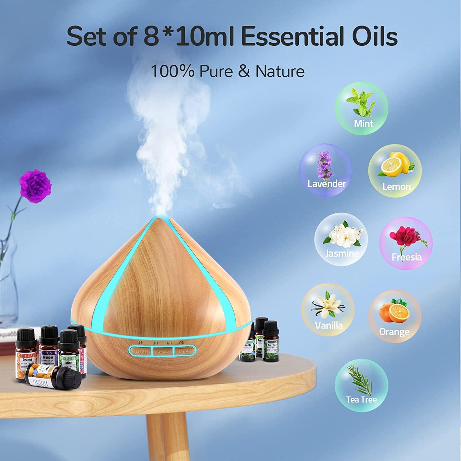 500ML Scented Oil Diffusers with 8 Essential Oils Set, Aromatherapy Diffusers Air Freshener, Diffusers with Remote Control, 4 Timer, Auto-waterless Shut-off for Bedroom, Large Room