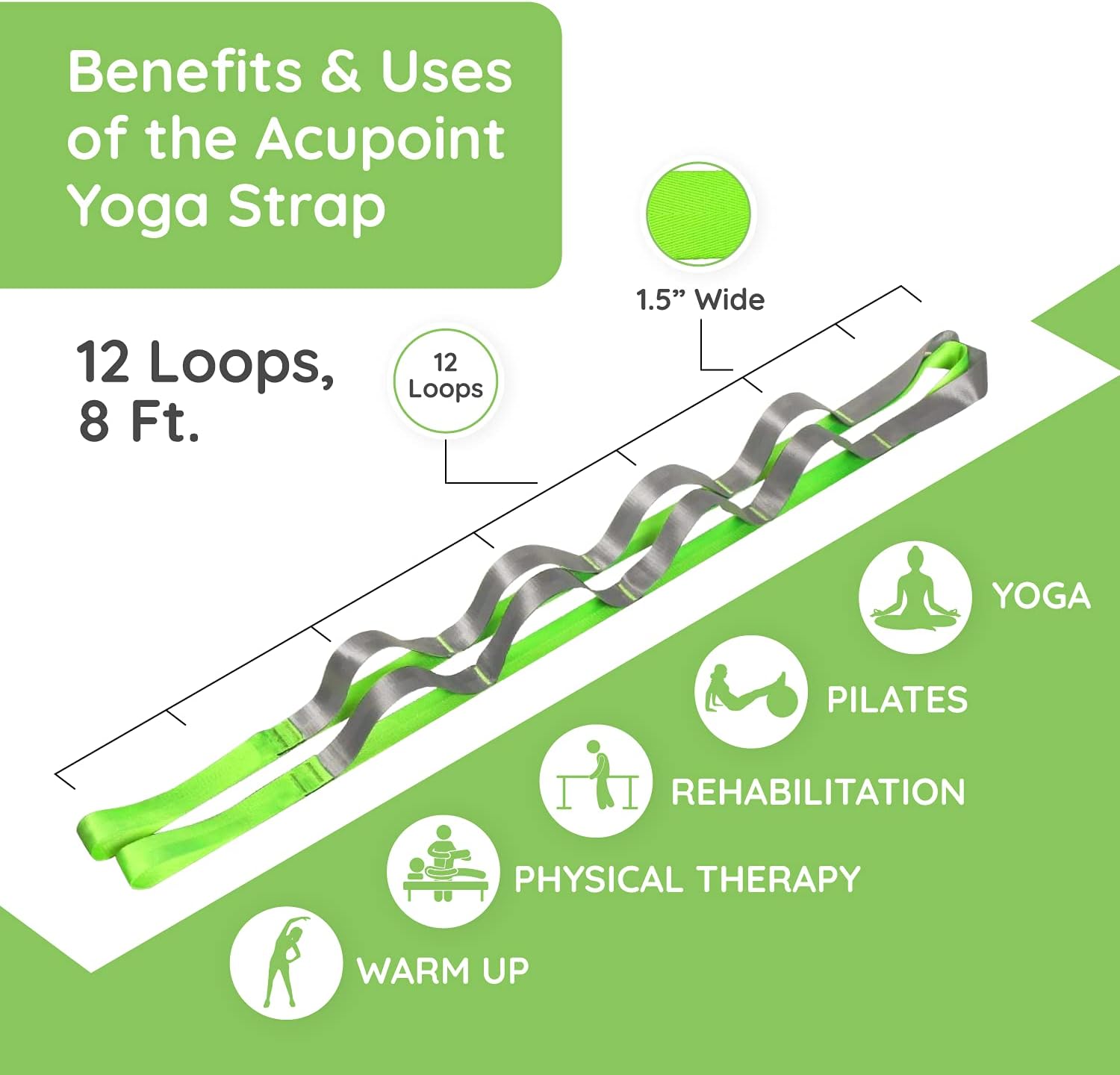 Acupoint Yoga Stretching Strap With Loops 12-Loop Exercise Strap for Physical Therapy, Flexibility, Pilates, Dance, Gymnastics, Recovery, Workout – Non-Elastic Premium-Woven Nylon Stretch Band