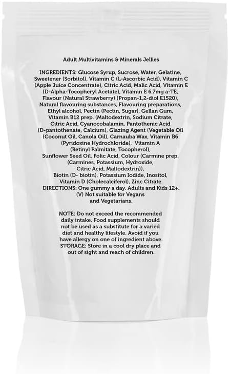 INGREDIENTS: Glucose Syrup, Sucrose, Water, Gelatine, Sweetener (Sorbitol), Vitamin C (L-Ascorbic Acid), Vitamin C (Apple Juice Concentrate), Citric Acid, Malic Acid, Vitamin E (D-Alpha-Tocopheryl Acetate), Vitamin E 6.7mg a-TE, Flavour (Natural Strawberry) (Propan-1,2-diol E1520), Natural flavouring substances, Flavouring preparations, Ethyl alcohol, Pectin (Pectin, Sugar), Gellan Gum, Vitamin B12 prep. (Maltodextrin, Sodium Citrate, Citric Acid, Cyanocobalamin, Pantothenic Acid (D-pantothenate, Calcium), Glazing Agent (Vegetable Oil (Coconut Oil, Canola Oil), Carnauba Wax, Vitamin B6 (Pyridoxine Hydrochloride), Vitamin A (Retinyl Palmitate, Tocopherol), Sunflower Seed Oil, Folic Acid, Colour (Carmine prep. (Carmines, Potassium, Hydroxide, Citric Acid, Maltodextrin)), Biotin (D- biotin), Potassium Iodide, Inositol, Vitamin D (Cholecalciferol), Zinc Citrate. DIRECTIONS: One gummy a day. Adults and Kids 12+. (V) Not suitable for Vegans and Vegetarians. NOTE: Do not exceed the recommended daily intake. Avoid if you have allergy on one of ingredient in bold above. Should not be used as a substitute for a varied diet. Always consult a doctor before using any supplements. STORAGE: Store in a tightly sealed bag/container and keep in a cool dry place away from moisture and out of sight and reach of children.