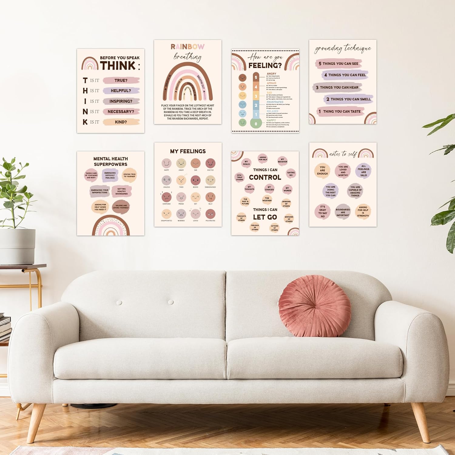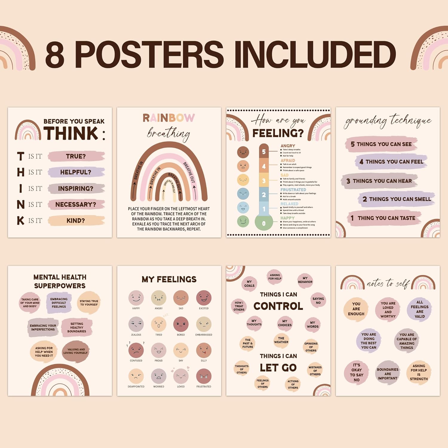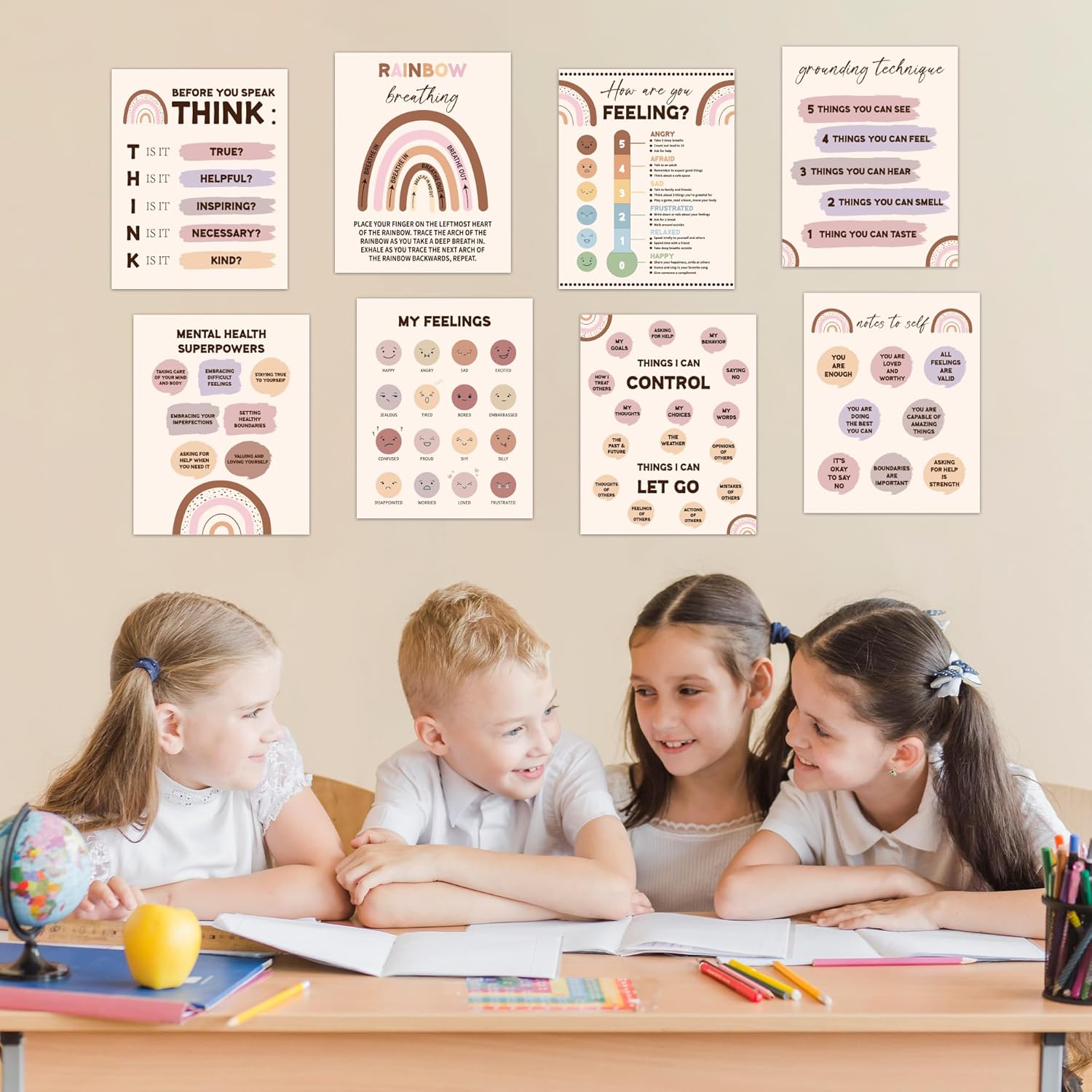 Adval9Vram Boho Calming Corner Chart – 8pcs Bohemia Rainbow Emotional Feelings Chart Poster, Wall Art Prints Children Preschool Education Supplies Mental Health Printed Posters for Classroom School