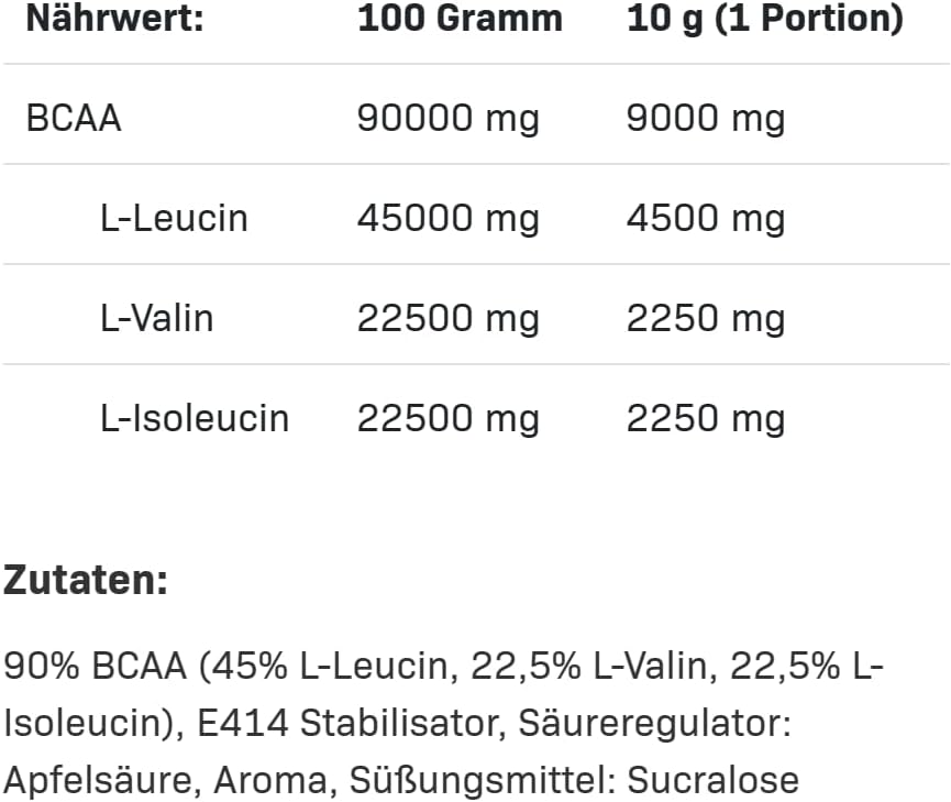 A combination of Leucine, Isoleucine and valine in the ratio of 2: 1: 1. It provides an effective post-workout regeneration, limits the catabolism during the workout, and supports the process of pure muscle mass building. Bcaa 2: 1: 1 should be used in the period of reduction, as well as, in the period of mass building. The raw material is of the highest quality from certified suppliers. It does not contain colorants.