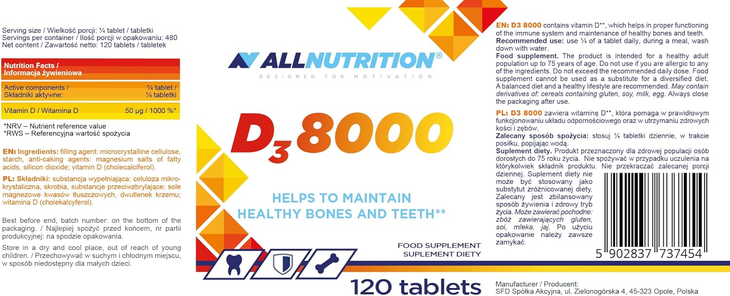 ALLNUTRITION D3 8000 Vitamin D Complex – Vitamin D Tablets – Vegetarian Supplements – Vitamins for Women & Men – Immune System Booster – Vitamin D and Calcium – 120 Tabs