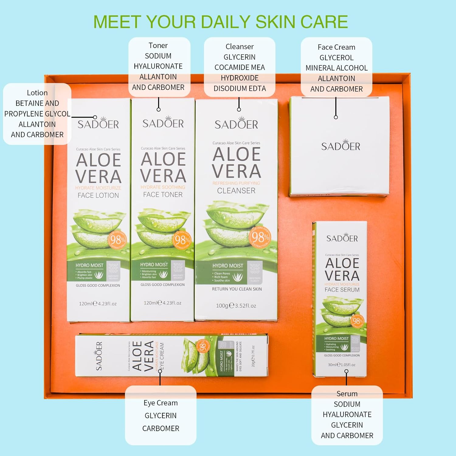 Hydrating Skin Care Set — This Aloe Vera skin care set boasts 6pcs favorite Daily Skin Care ,which can deeply nourish and moisturize your skin, fulfillment your skin every day hydrating requirement.
