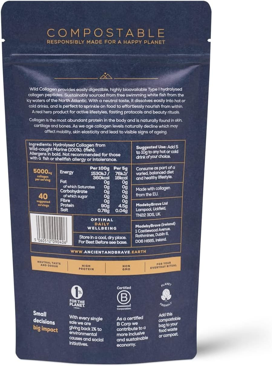 Ancient + Brave Wild Collagen 200g – Wild Caught Marine Collagen Powder – 100% Hydrolysed Collagen Peptides (Fish) – High Protein, Fasting, Keto – Anti-Ageing, Skin, Hair & Nail Health