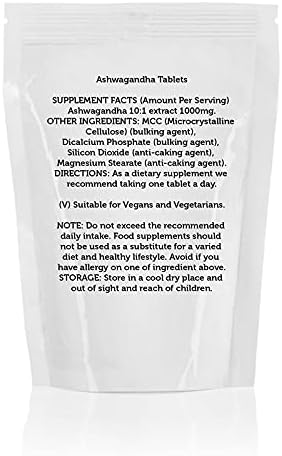 Ashwagandha Tablets Adaptogen Extract 10:1 1000mg Withania Somnifera Indian Ginseng Gooseberry SUPPLEMENT FACTS (Amount Per Serving) Ashwagandha 10:1 extract 1000mg. OTHER INGREDIENTS: MCC (Microcrystalline Cellulose) (bulking agent), Dicalcium Phosphate (bulking agent), Silicon Dioxide (anti-caking agent), Magnesium Stearate (anti-caking agent). DIRECTIONS: As a dietary supplement we recommend taking one tablet a day. (V) Suitable for Vegans and Vegetarians. NOTE: Do not exceed the recommended daily intake. Avoid if you have allergy on one of ingredient in bold above. Should not be used as a substitute for a varied diet. Always consult a doctor before using any supplements.