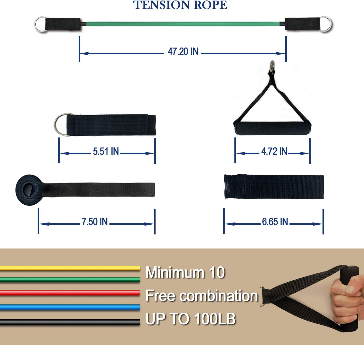 ??Exercise equipment set–Can be used alone stacked in any combination to a maximum equivalent of 100 lbs, include Yellow (10 lbs.), Green(15 lbs.), Red(20 lbs.), Blue(25 lbs.), Black (30 lbs.), all exercise bands are 48″ in length.