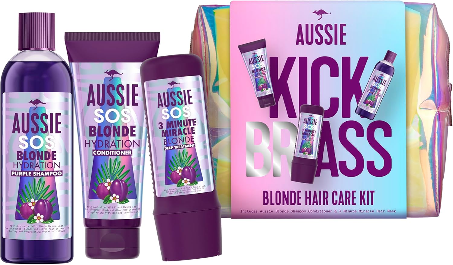 Blonde hair calling SOS? Don’t panic! We’re throwing you a lifeline with this Aussie gift set for blonde hair in despair! The kick (br)ass purple shampoo neutralises brassy, yellow tones to leave blonde hair boosted, hydrated and bright! The miraculous silicone-free conditioner provides a much-needed boost of hydration and shine to your blonde or silver blonde hair, whether it’s short or long, ash, golden or platinum. The miraculous deep treatment will give your golden locks – be they strawberry, natural or dyed – a powerful shot of moisture and nourishment when they’re most in need. Infused with Australian superfruits, this terrific trio is the perfect gift to leave blonde and silver hair bright & hydrated