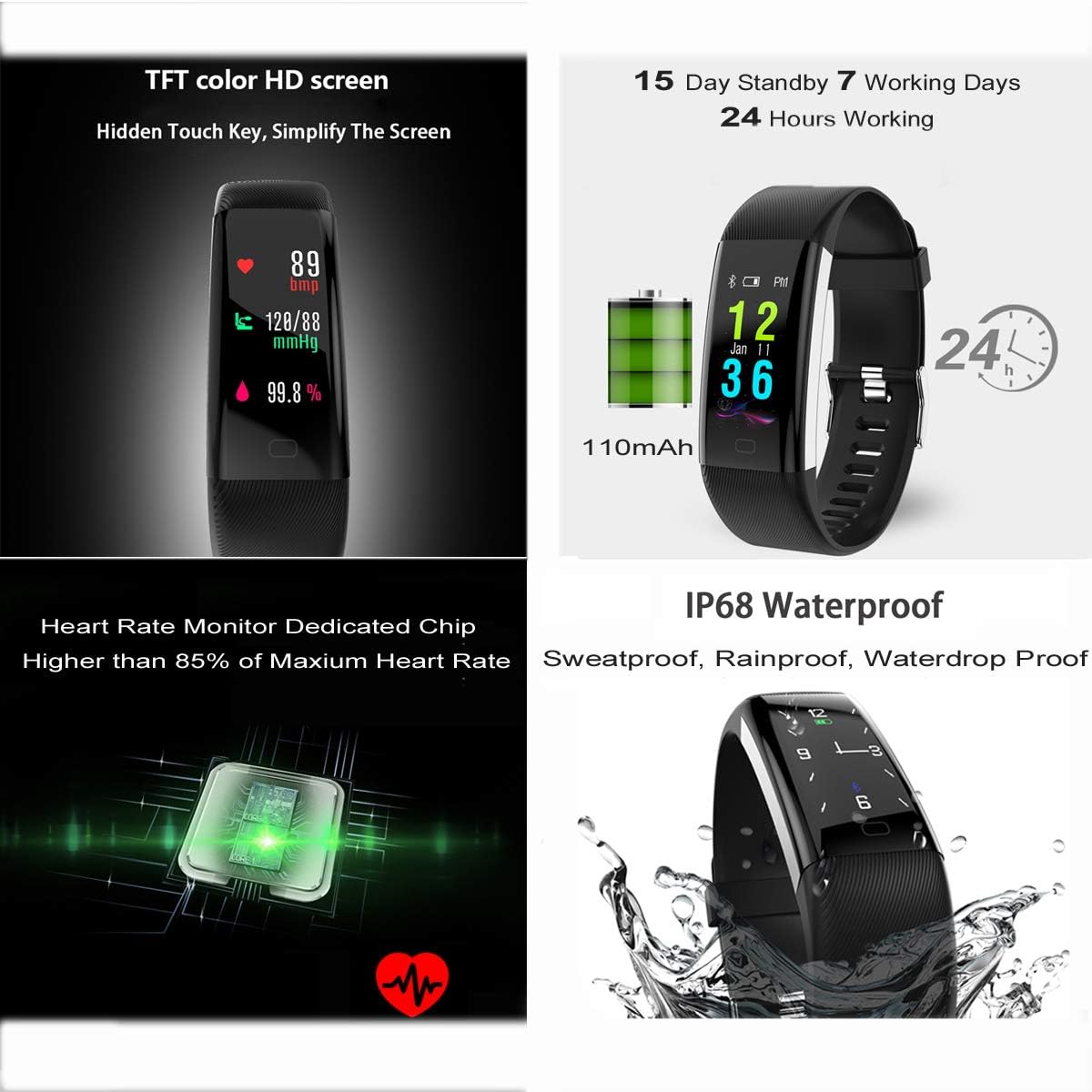IP68 Waterproof: Protect the fitness tracker well in water with a depth of more than 1 meter. NO worry when Washing, raining, swimming, etc.