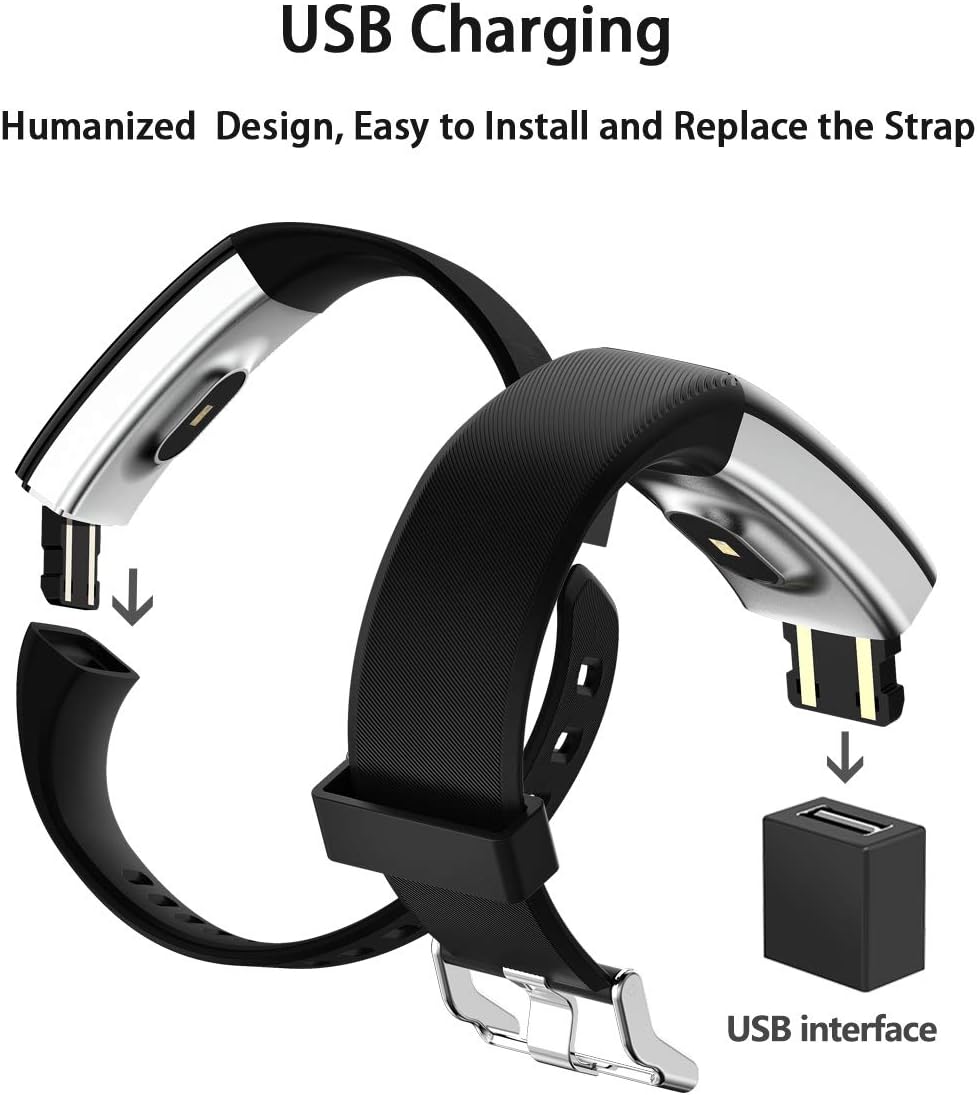 The activity tracker is easy to charge with long time 110mAh Polymer Battery: With USB charging port, it only requires about 1-1.5 hours for full charge and the standby time can be up to 5-7 days with full power. (Note: Only one of the USB port is for charging)
