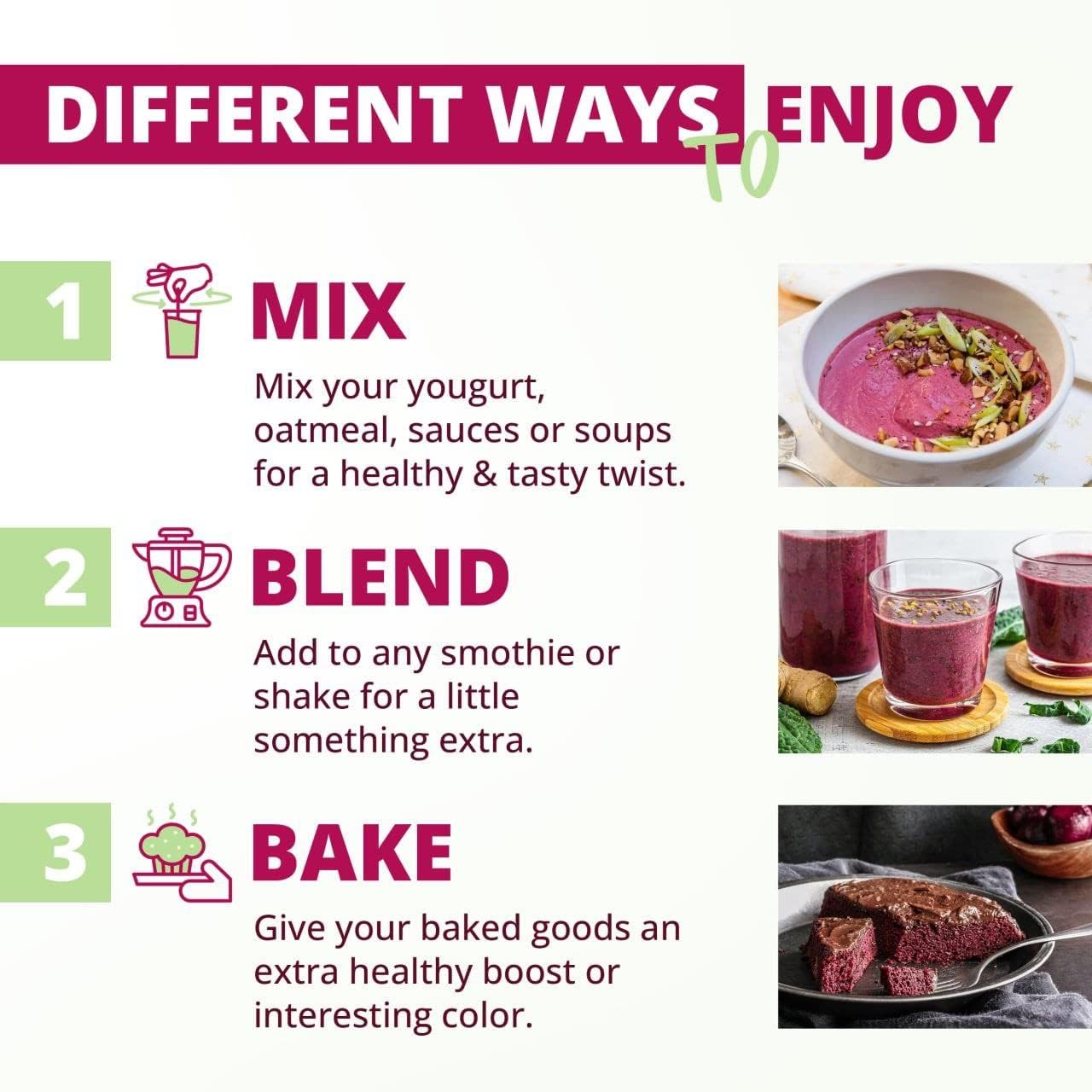 The perfect supplement: Our organic beetroot powder is designed to be added almost anywhere. Add it to your morning smoothie. Add it to water, juice or any other drink. This beetroot extract powder can be used in dips and hummus, soups and sauces, yogurt, protein shakes and more. The powder does not clump when mixed.