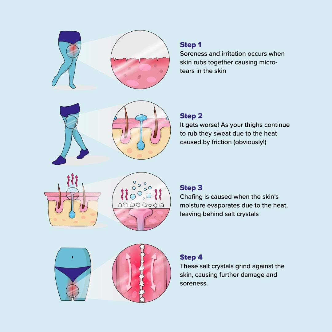 Water Resistant (& Sweat Resistant) and Non Greasy – Made from smart, high performance ingredients designed to resist water and sweat its your perfect companion to help those who are prone to chafing. Not like petrolium jelly or other ‘chub rub’ products. It leaves a silky smooth veil over the skin to reduce friction and ease any areas agitated by friction and rubbing.
