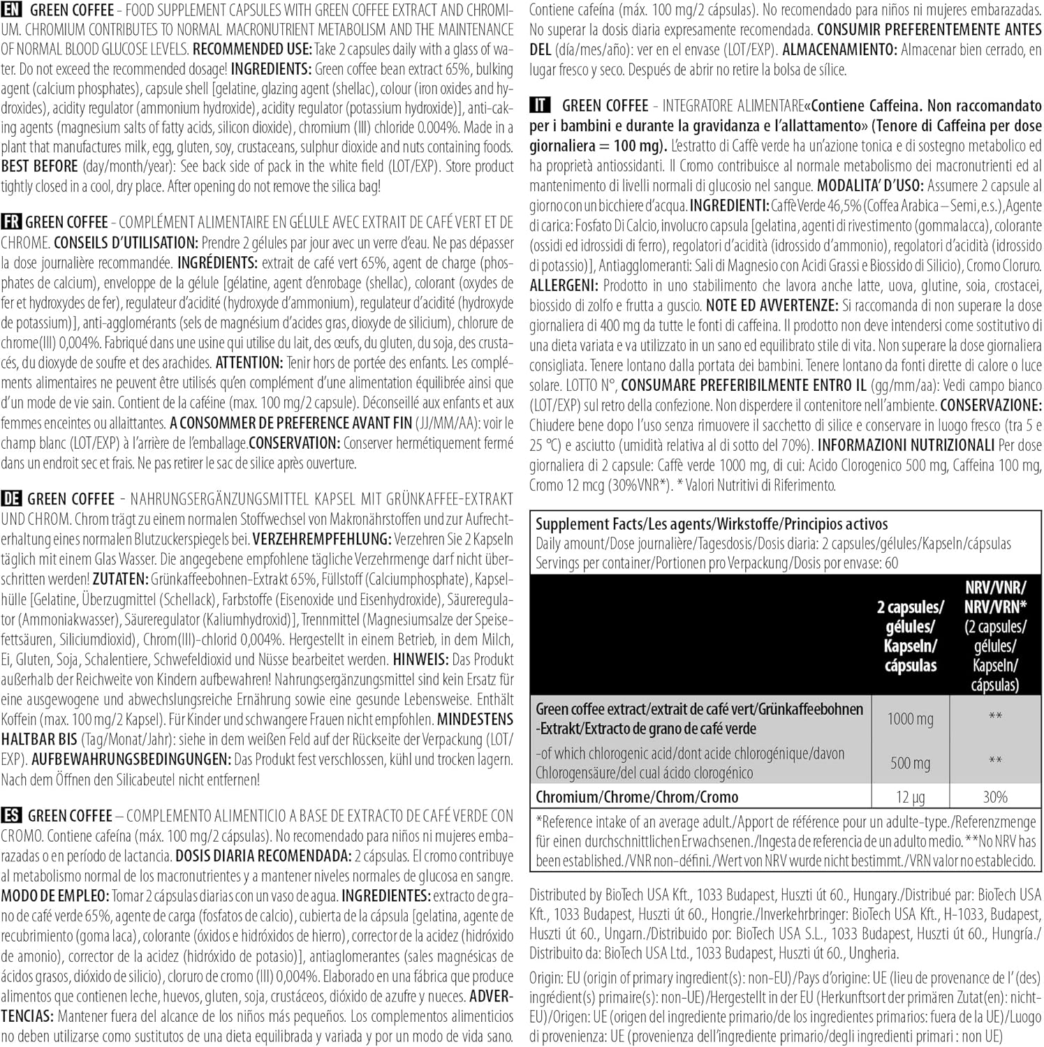 Green coffee extract, -of which chlorogenic acid, Chromium, Green coffee bean extract 65%, capsule shell [gelatin, water, colours (titanium dioxide, iron oxides and hydroxides)], bulking agent (calcium phosphates), anti-caking agents (magnesium salts of fatty acids, silicon dioxide), chromium (III) chloride 0.004%. Made in a plant that manufactures milk, egg, gluten, soy, crustaceans, sulphur dioxide and nuts containing foods.