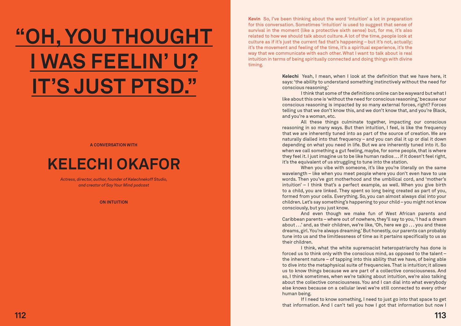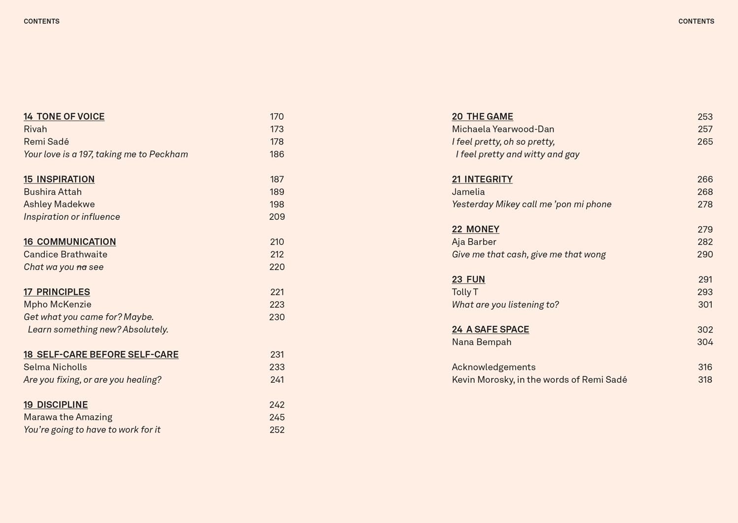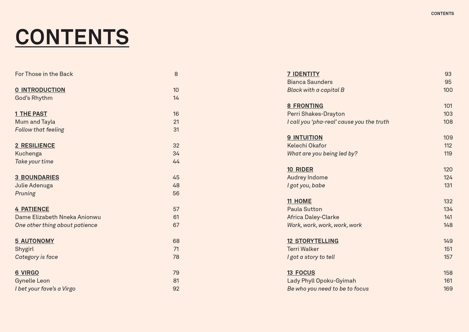 INCLUDING CONVERSATIONS WITH: MUM AND TAYLA ON THE PAST / KUCHENGA ON RESILIENCE / JULIE ADENUGA ON BOUNDARIES / DAME ELIZABETH NNEKA ANIONWU ON PATIENCE / SHYGIRL ON AUTONOMY / GYNELLE LEON ON BEING A VIRGO / BIANCA SAUNDERS ON IDENTITY / PERRI SHAKES-DRAYTON ON FRONTING / KELECHI OKAFOR ON INTUITION / AUDREY INDOME ON COLLABORATION / PAULA SUTTON AND AFRICA DALEY-CLARKE ON HOME / TERRI WALKER ON STORYTELLING / LADY PHYLL OPOKU-GYIMAH ON FOCUS / RIVAH ON INTENT / REMI SADÉ ON ESSENCE / BUSHIRA ATTAH AND ASHLEY MADEKWE ON FRIENDSHIP / CANDICE BRATHWAITE ON COMMUNICATION / MPHO MCKENZIE ON WINNING AND LOSING / SELMA NICHOLLS ON SELF-CARE BEFORE SELF-CARE / MARAWA THE AMAZING ON DISCIPLINE / MICHAELA YEARWOOD-DAN ON PLAYING THE GAME / JAMELIA ON INTEGRITY / AJA BARBER ON MONEY / TOLLY T ON FUN / NANA BEMPAH ON SAFE SPACES