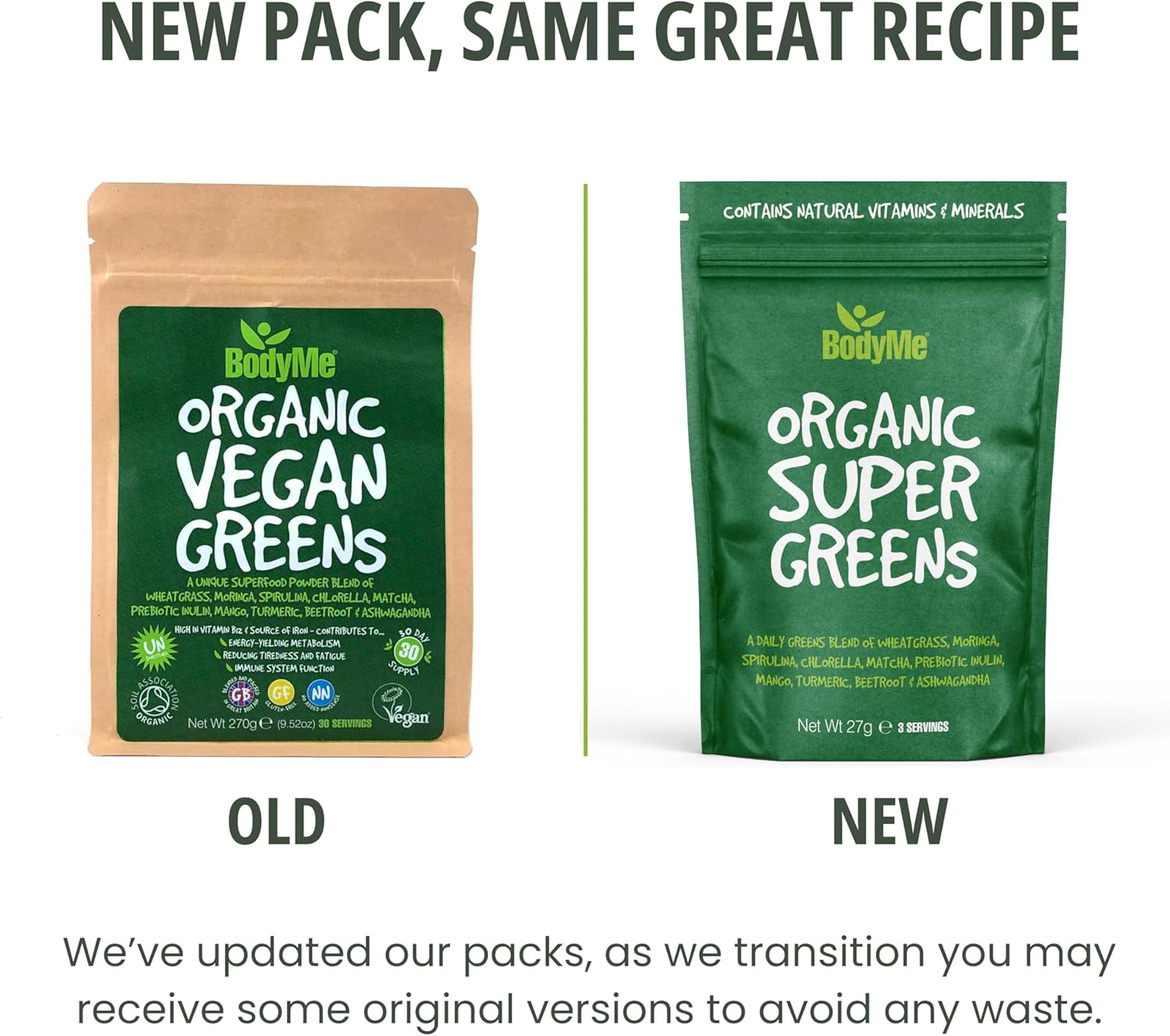 BodyMe Organic Vegan Greens Powder | 270g | Super Greens Blend | with Wheatgrass Moringa Spirulina Chlorella Matcha Prebiotic Inulin Mango Turmeric Beetroot Ashwagandha