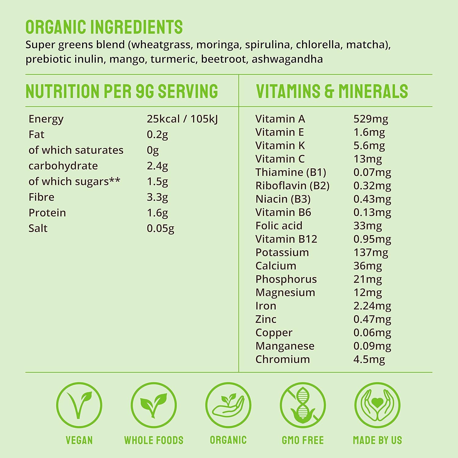 ✅ NOURISH – With clean balanced organic vegan greens with no added nonsense, no artificial fillers, binders, preservatives, GMO’s or gluten… Our super greens contains 10 of the finest organic superfoods including wheatgrass, moringa, spirulina, chlorella, matcha, prebiotic inulin, mango, turmeric, beetroot and ashwagandha for a healthy mind, body and soul.