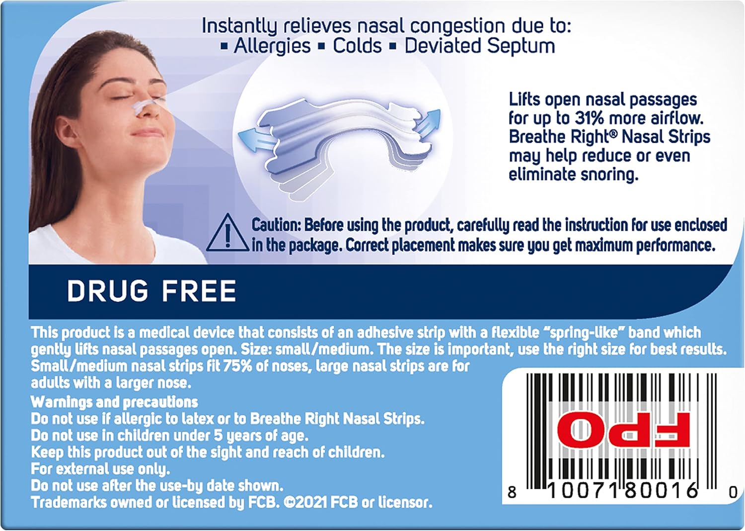 Breathe Right Nasal Strips are flexible spring-like fabric bands that gently lift & open your nose for improved airflow, helping you to breathe better