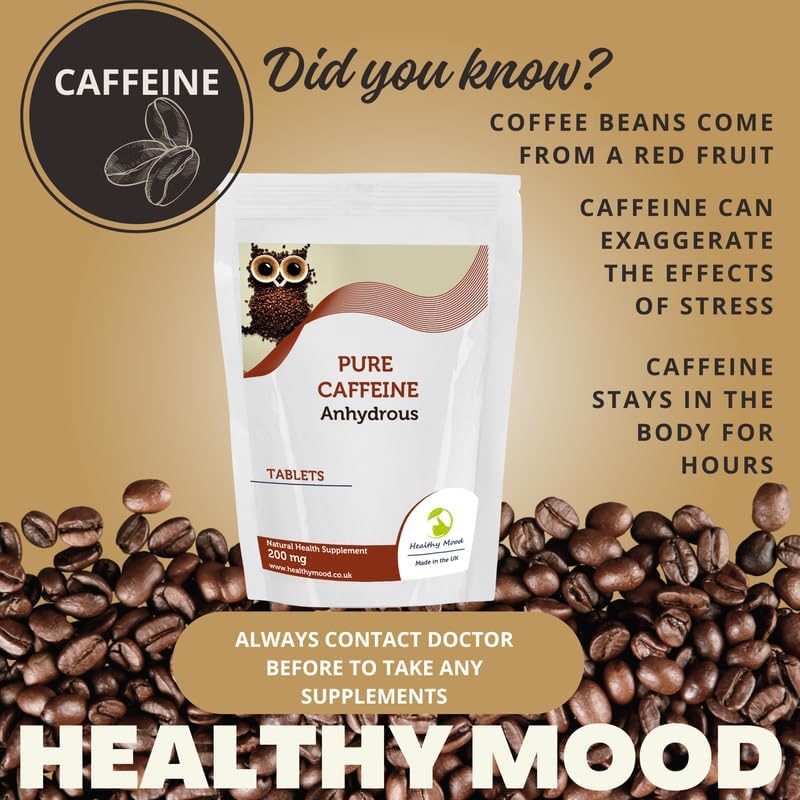 Caffeine Tablets SUPPLEMENT FACTS (Amount Per Serving) Caffeine 200mg. OTHER INGREDIENTS: Microcrystalline Cellulose, Dicalcium Phosphate, Magnesium Stearate, Silica. DIRECTIONS: 1-2 tablets per day with a meal as a food supplement. (V) Suitable for Vegans and Vegetarians. Allergens Free. NOTE: Do not exceed the recommended daily intake. Avoid if you have allergy on one of ingredient in bold above. Should not be used as a substitute for a varied diet. Always consult a doctor before using any supplements. STORAGE: Store in a tightly sealed bag/container and keep in a cool dry place away from moisture and out of sight and reach of children.