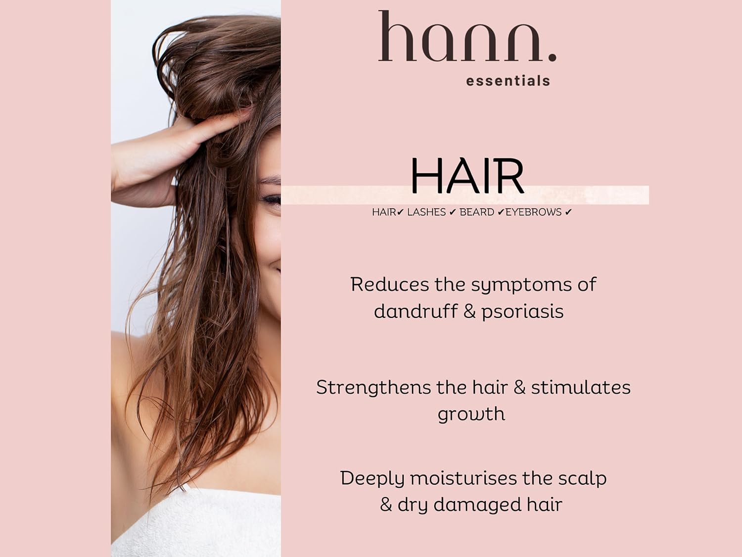 HAIR – Reduces the symptoms of dandruff & psoriasis – strengthens the hair & stimulates growth – deeply moisturises the scalp & dry damaged hair.