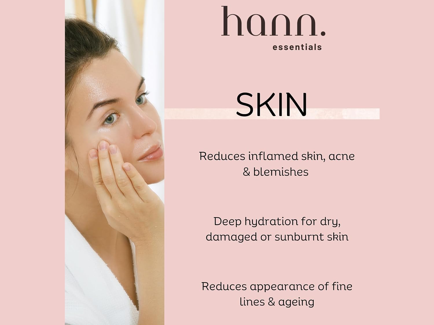 SKIN – Reduces inflamed skin, acne and blemishes – deep hydration for dry, damaged or sunburnt skin – reduces appearance of fine lines and ageing.