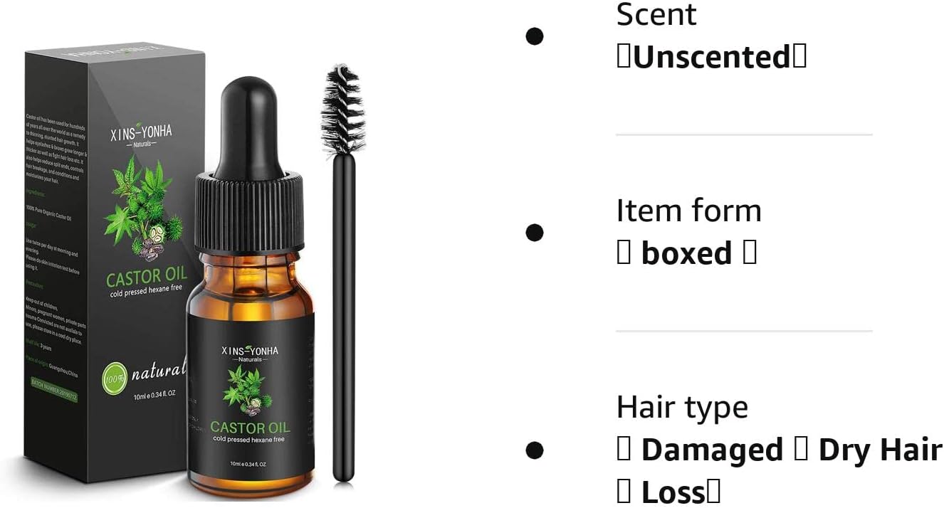 Castor Oil, Hair Growth Oil Pure Cold Pressed Castor Oil for Eyelashes Eyebrows Lash Nail, Hair Growth Serum Eyebrow Growth Serum Lash Oil with Eyelash Brush Skin Care Ricin Oil (10ml)