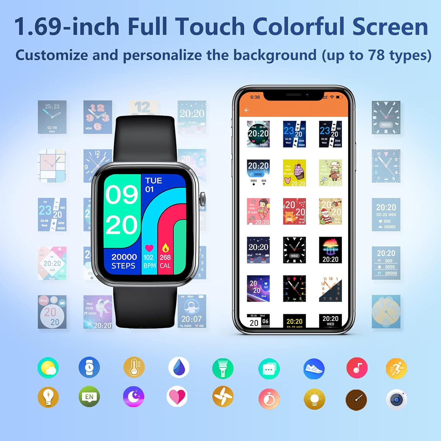 【1.69″ Full Touch Screen & Customizable Dial】This fitness watch is equipped with a 1.69″ color display that provides excellent high-definition picture quality. Raise your wrist and the display will automatically light up. It has 5 levels of brightness, and you can adjust the brightness to Clearly see the display content. Use the latest watch face series to easily switch your watch desktop, you can also customize the watch face and create your style. Your watch, your style.