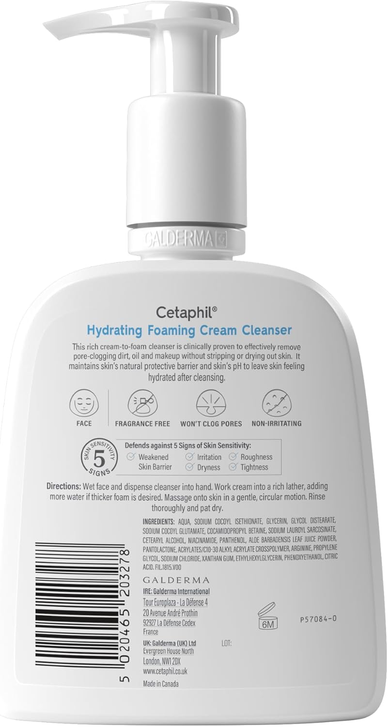 Cetaphil Hydrating Foaming Cream Cleanser, 473ml, Face Wash with Niacinamide for Normal, Dry or Sensitive Skin, Vegan-Friendly