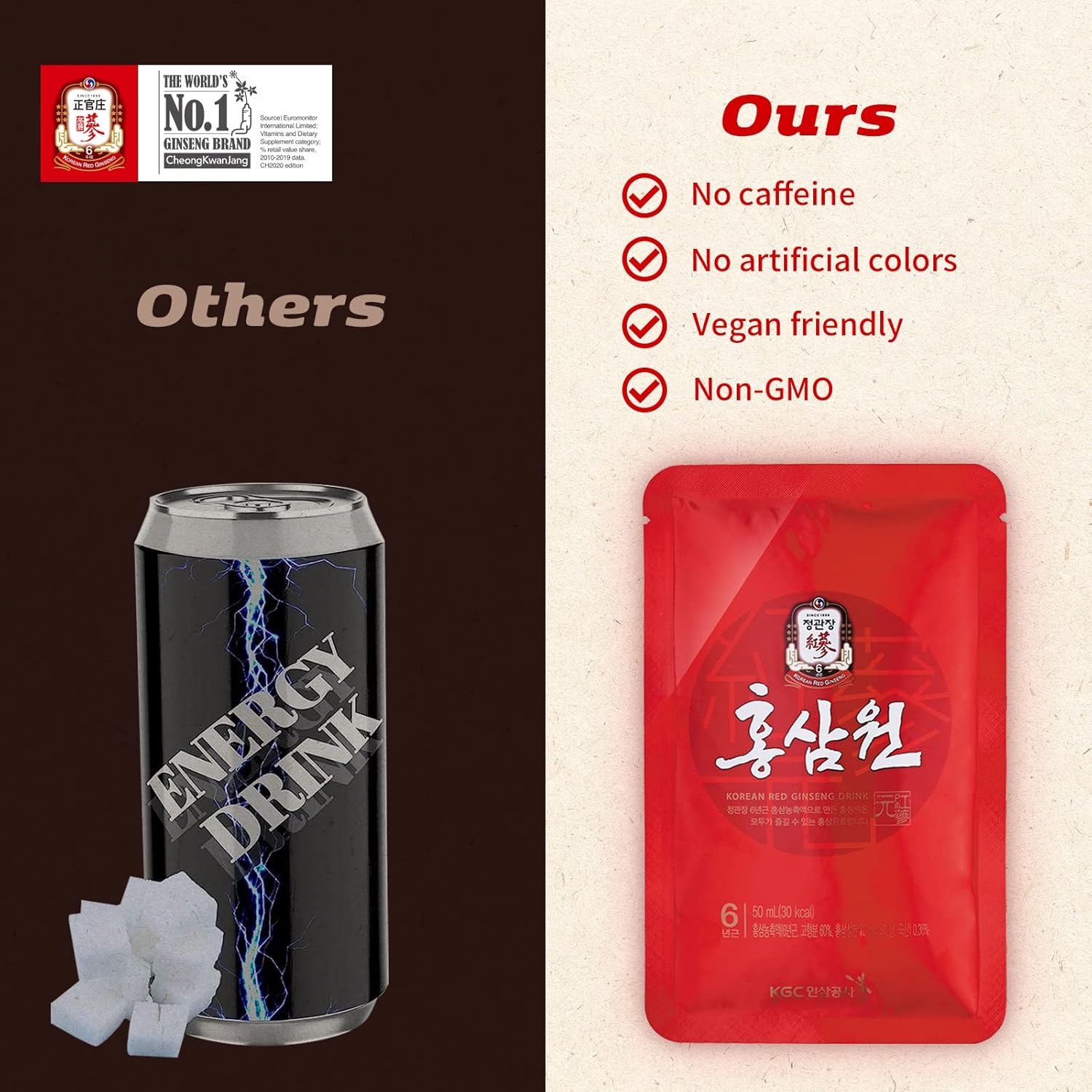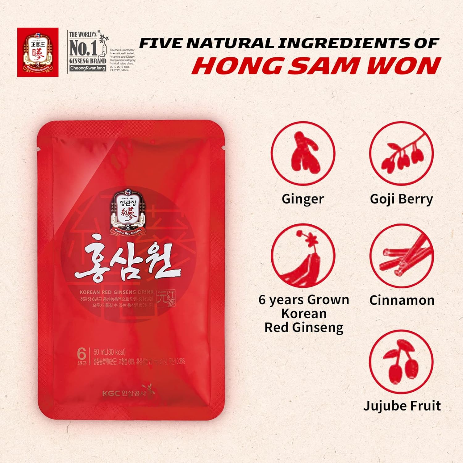 CheongKwanJang Korean Red Ginseng Drink, Hong Sam Won, Pre Workout Energy Drink for Men & Women, Boost Productivity, Blood Circulation, 6-Year Korean Ginseng, 50mlx30