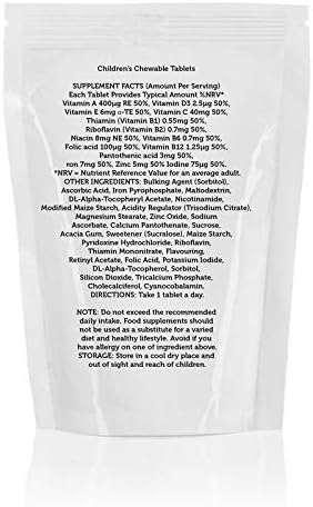SUPPLEMENT FACTS (Amount Per Serving) Each Tablet Provides Typical Amount %NRV* Vitamin A 400µg RE 50%, Vitamin D3 2.5µg 50%, Vitamin E 6mg α-TE 50%, Vitamin C 40mg 50%, Thiamin (Vitamin B1) 0.55mg 50%, Riboflavin (Vitamin B2) 0.7mg 50%, Niacin 8mg NE 50%, Vitamin B6 0.7mg 50%, Folic acid 100µg 50%, Vitamin B12 1.25µg 50%, Pantothenic acid 3mg 50%, Iron 7mg 50%, Zinc 5mg 50% Iodine 75µg 50%. *NRV = Nutrient Reference Value for an average adult. OTHER INGREDIENTS: Bulking Agent (Sorbitol), Ascorbic Acid, Iron Pyrophosphate, Maltodextrin, DL-Alpha-Tocopheryl Acetate, Nicotinamide, Modified Maize Starch, Acidity Regulator (Trisodium Citrate), Magnesium Stearate, Zinc Oxide, Sodium Ascorbate, Calcium Pantothenate, Sucrose, Acacia Gum, Sweetener (Sucralose), Maize Starch, Pyridoxine Hydrochloride, Riboflavin, Thiamin Mononitrate, Flavouring, Retinyl Acetate, Folic Acid, Potassium Iodide, DL-Alpha-Tocopherol, Sorbitol, Silicon Dioxide, Tricalcium Phosphate, Cholecalciferol, Cyanocobalamin. DIRECTIONS: Take 1 tablet a day. NOTE: Do not exceed the recommended daily intake. Avoid if you have allergy on one of ingredient above. Should not be used as a substitute for a varied diet. Store in a cool dry place and out of sight and reach of children. This product contains Vitamin A: do not take if you are pregnant or likely to become pregnant, except on the advice of a doctor or antenatal clinic. Contains Iron, which, if taken in excess, may be harmful to young children. Excessive consumption may produce laxative effects. (V) Suitable for Vegetarians, GMO Free, Non-irradiated.