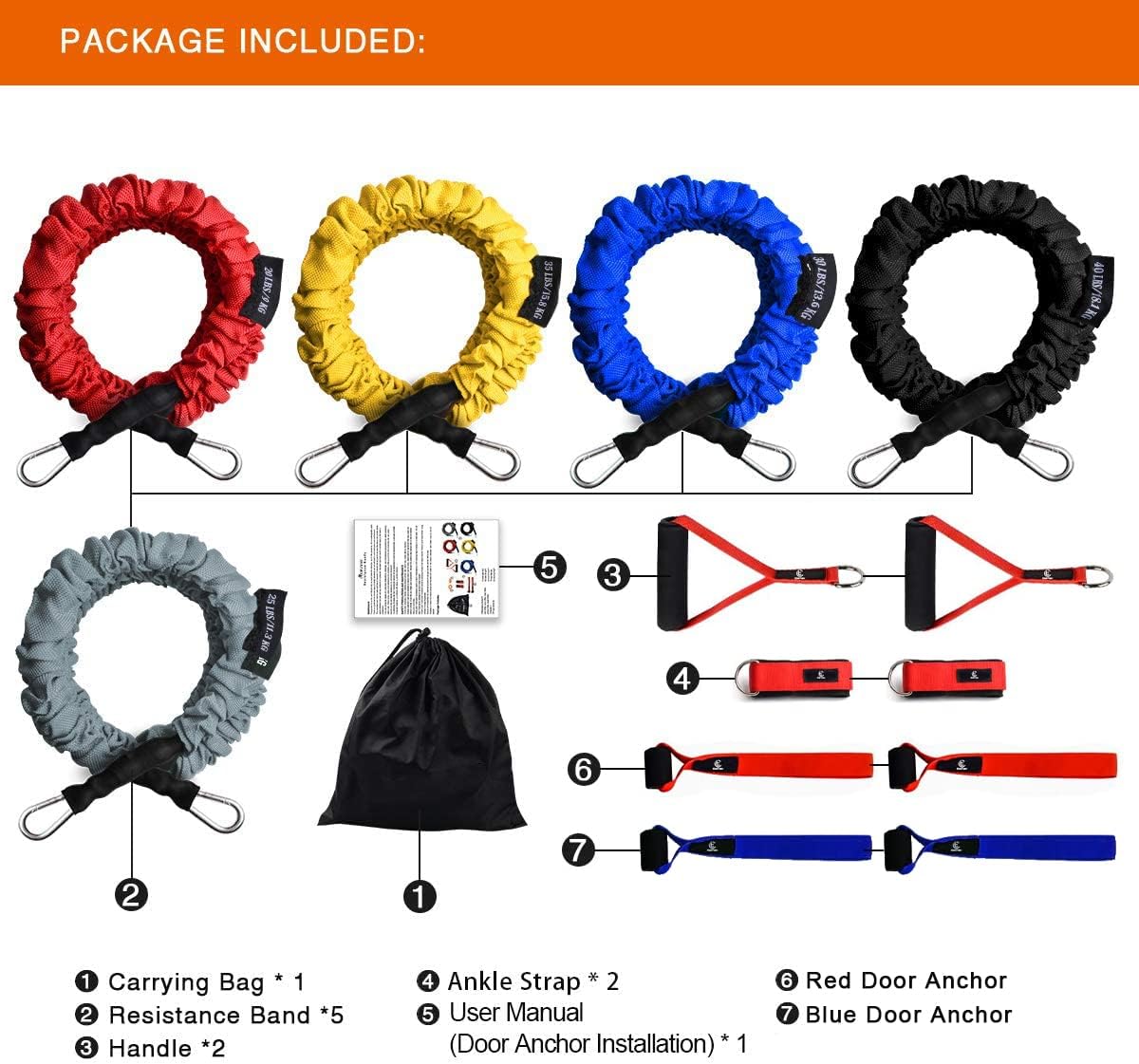 ❃ 14PCS PREMIUM RESISTANCE BANDS SET – Includes 5 metal clip resistance tube bands: Red (20lbs), Gray (25lbs), Blue (30lbs), Yellow (35lbs), Black (40lbs); 2 high-density foam handles, 2 ankle straps, 2 red door anchors, 2 blue door anchors,1 carrying bag.