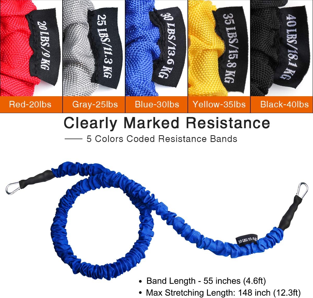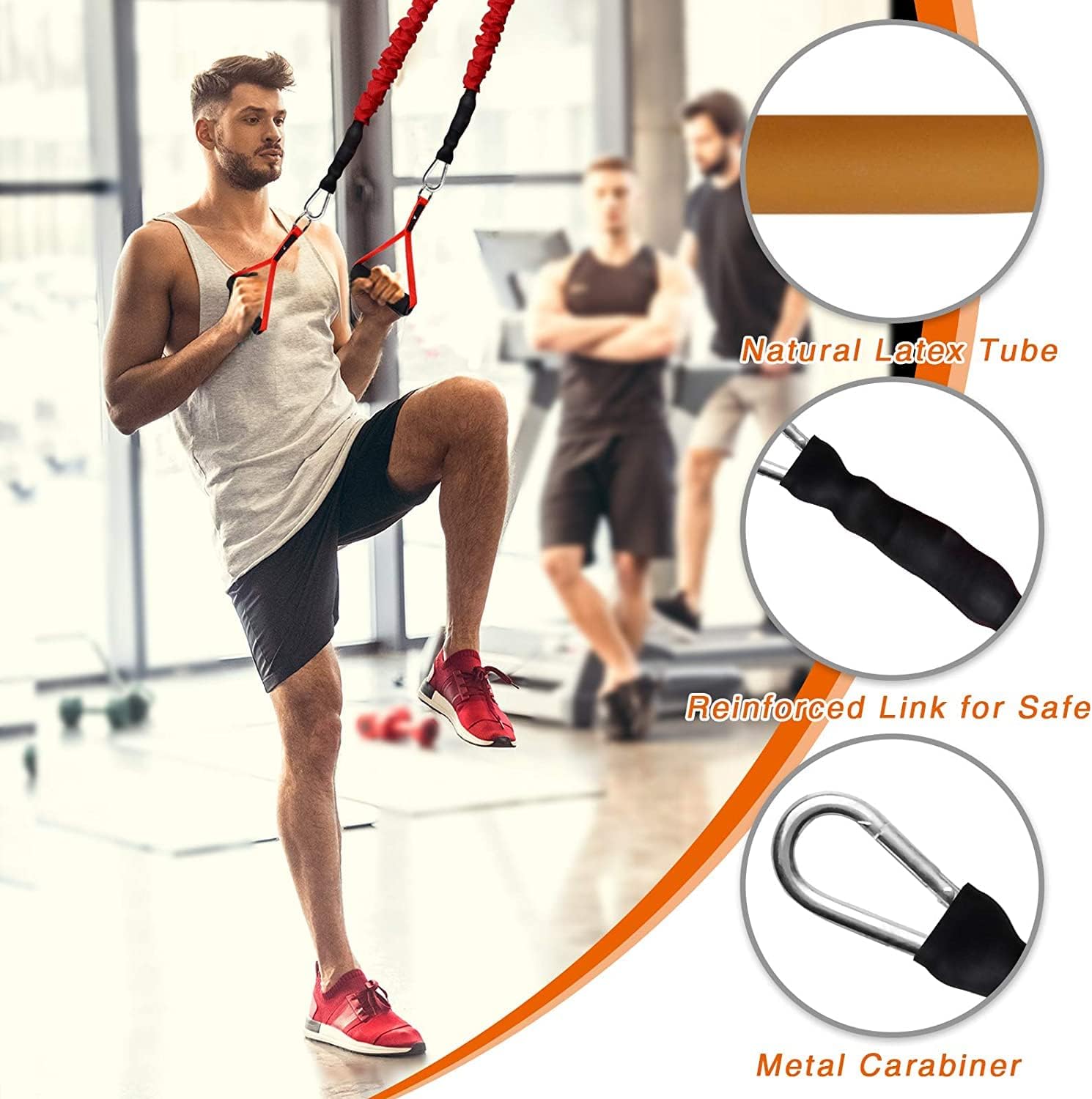 ❃ COMBINABLE RESISTANCE FOR ANY FITNESS LEVEL – Our exercise bands are color-coded and individually labeled. The metal carabiner on the band can be used alone or stacked in any combination to achieve your optimal resistance level from 20 lbs to maximum 150 lbs.