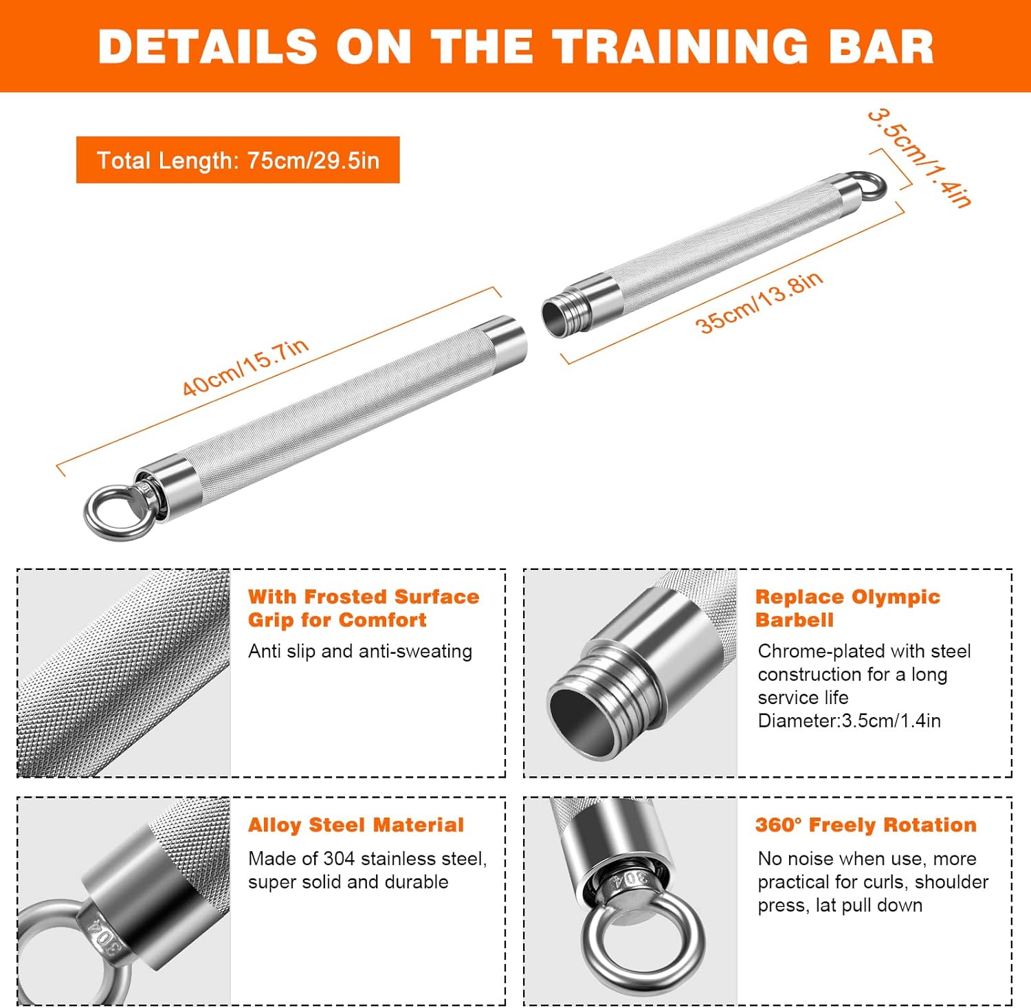 ➤ 【Durable, Safe & Comfortable】Our exercise bar is specially machined alloy steel bar with internal bearings, not easily out of shape, bent, or damaged, can bear 500LBS. Strong hanging loop on both sides, can rotate 360°. With frosted surface grip for comfort, anti slip, and anti- sweating, can effectively prevent accidental injuries caused by hand slipping during exercise