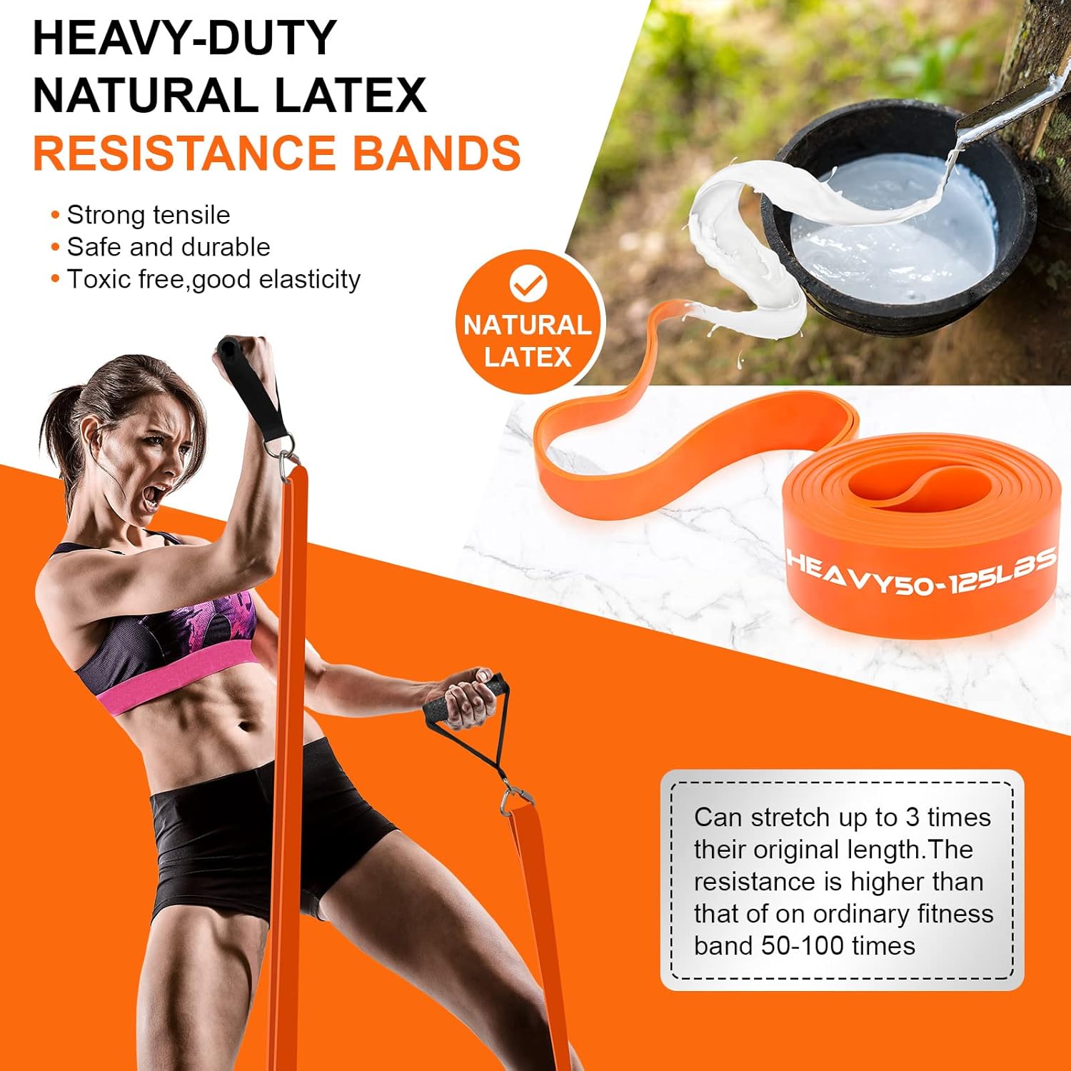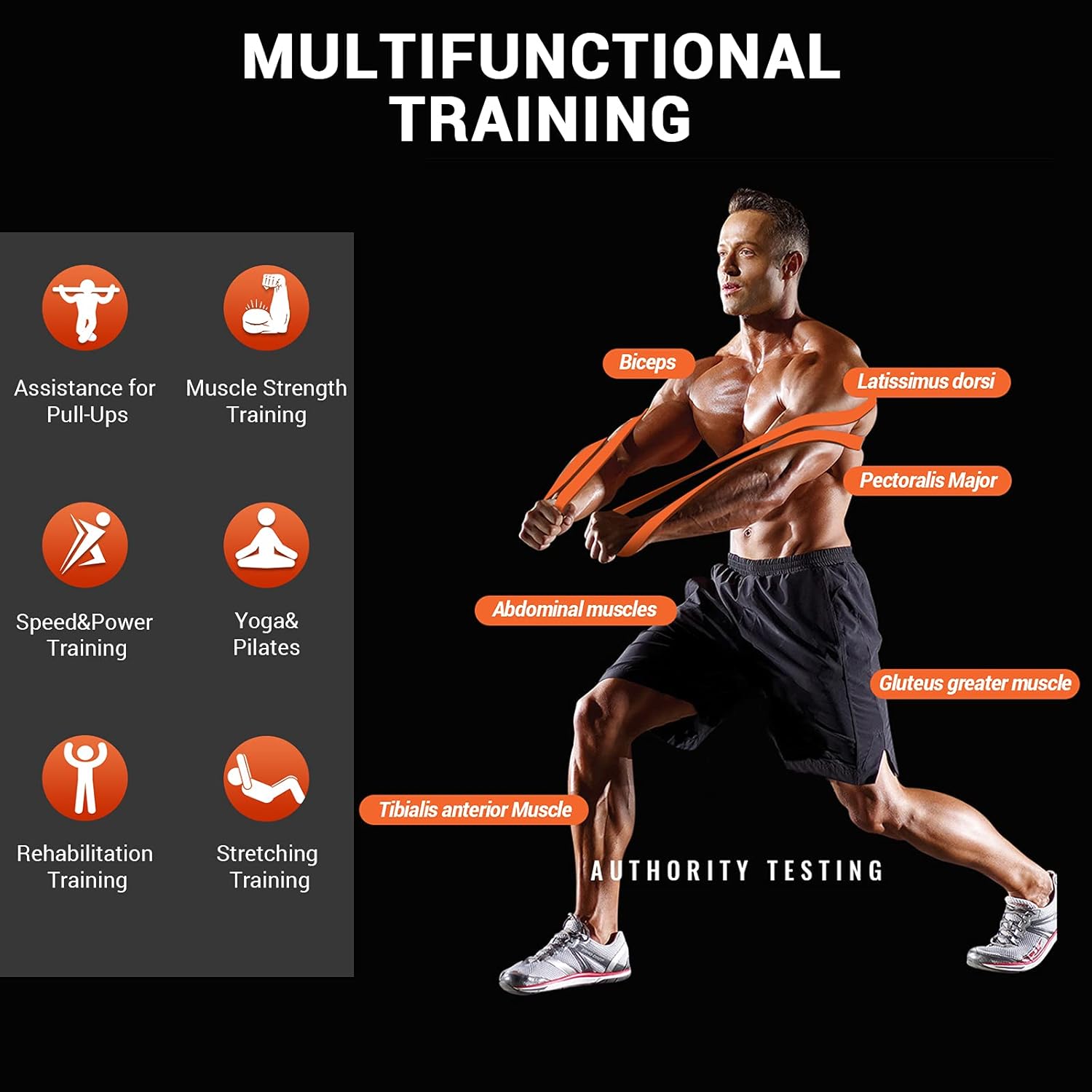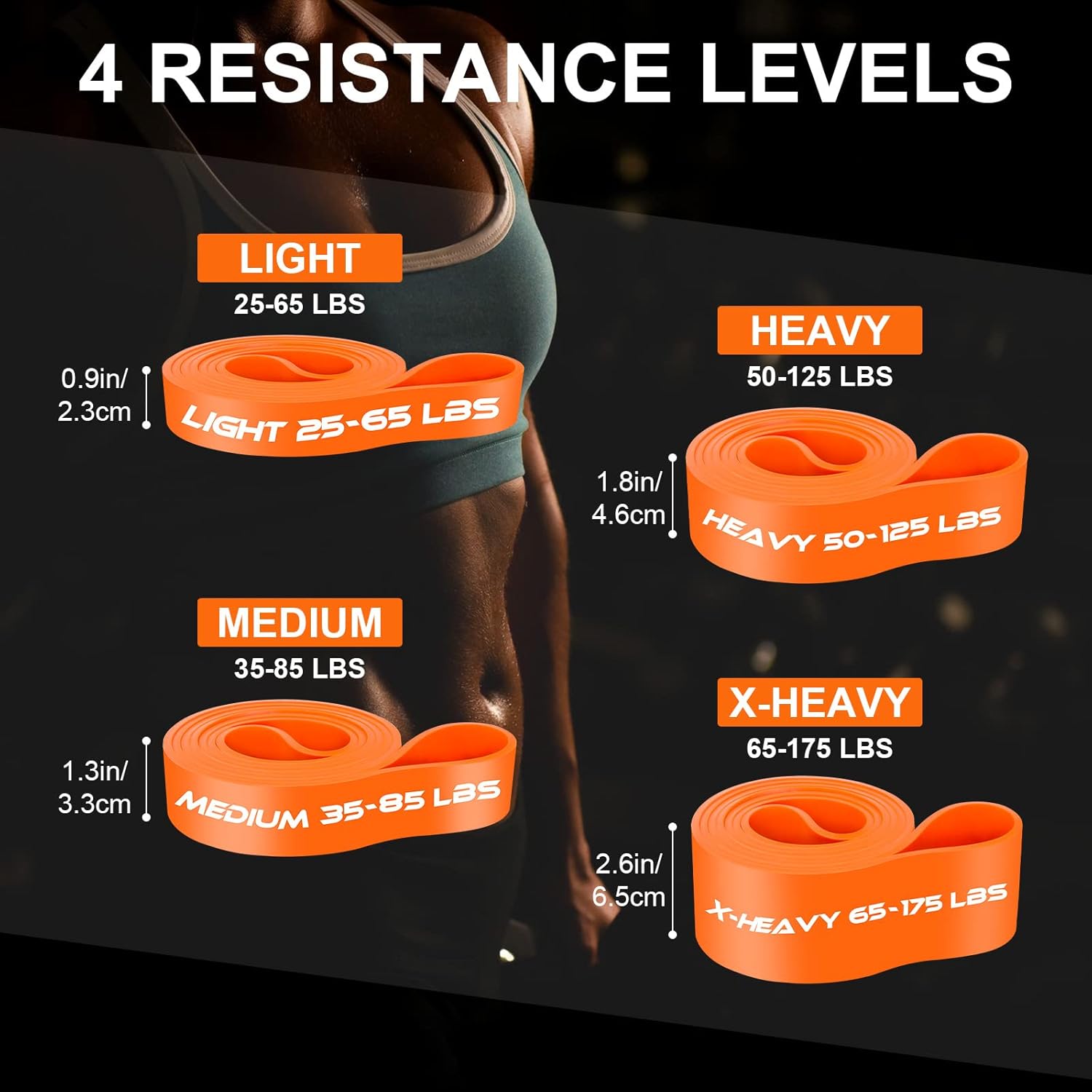 【4 Exercise Bands Levels】This resistance band set contains 4 resistance levels, Light (25-65 pounds), Medium (35-85 pounds), Heavy (50-125 pounds), and X-Heavy (65-175 pounds). Resistance bands can be used alone or combine multiple workout bands to increase the challenge.