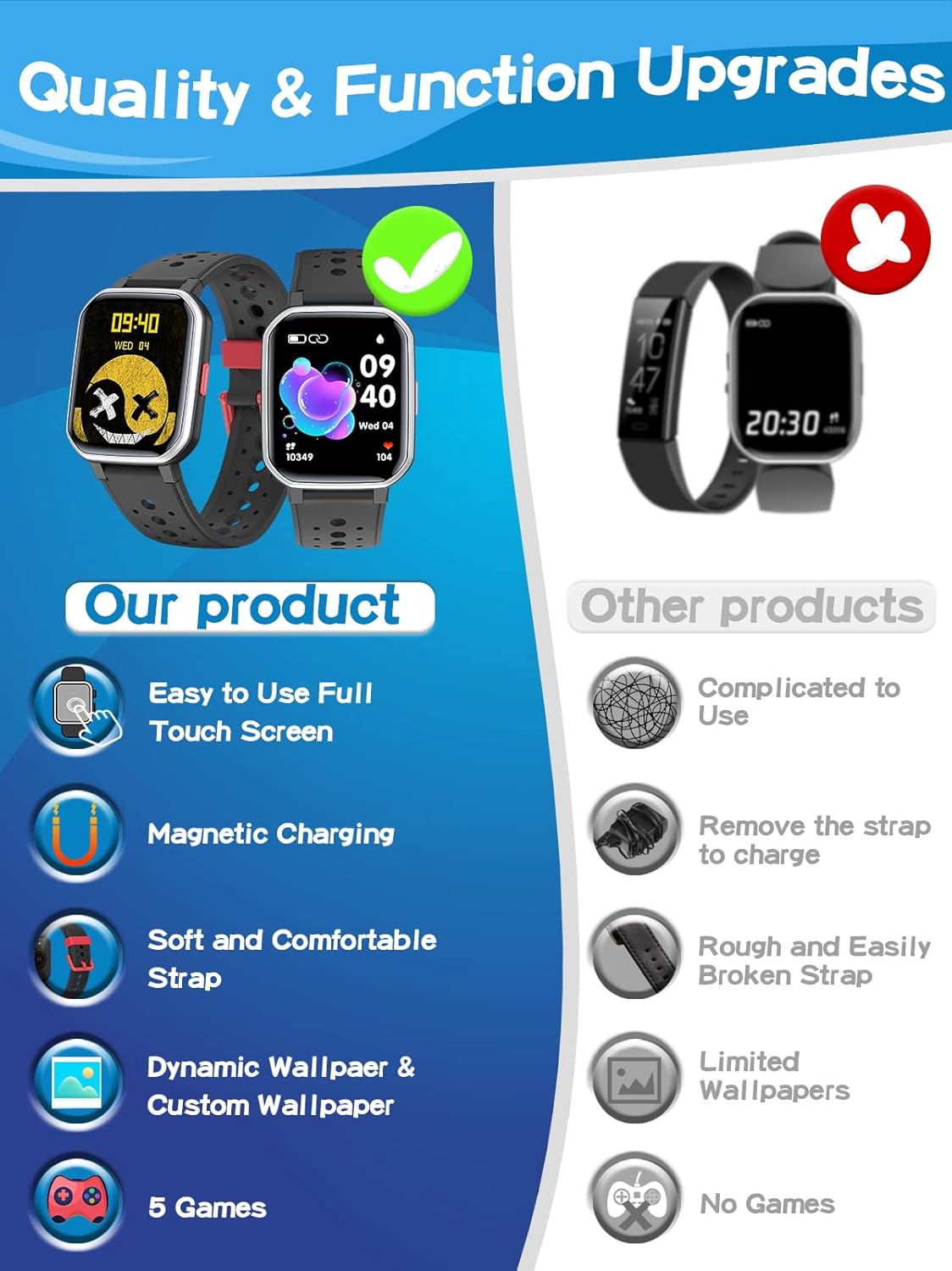 ⌚【Upgraded Kids Smart Watch】DIGEEHOT kids watch has three menu styles to choose from. The watch comes with rich functions including funny games, cute live wallpapers, 20 sport modes activity tracking, heart rater and sleep monitor, intelligent reminder, music & camera control through app, stopwatch, timer, alarm clock, female function, etc. Gifts for boys, girls and teens ages 6-16.
