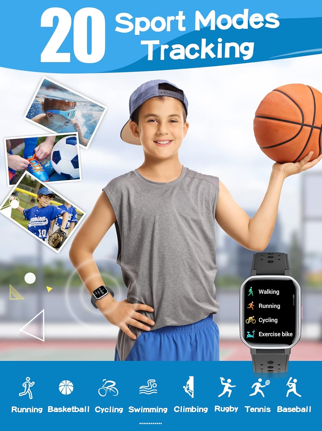 🏃【Kids Sport Activity Tracking】The Kids fitness tracker watch equipped with 20 sport modes, such as running, walking, biking, swimming, various sports and ball games. Record various exercise data, such as calories burned, distance exercised and heart rate during exercise. Use data to better manage kids workouts and meet the diverse sports needs of children. The watch is also waterproof so it can be used while swimming.